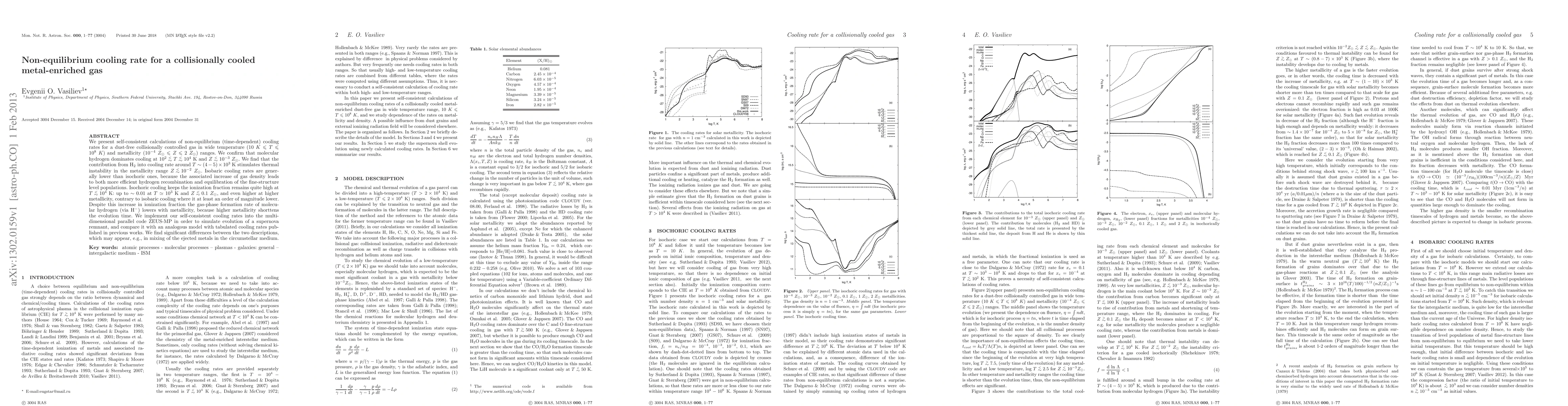 We present self-consistent calculations of non-equilibrium (time-dependent) cooling rates for a dust-free collisionally controlled gas in wide temperature ($10 K\le T\le 10^8 K$) and metallicity ($10^{-4} Z_\odot \le Z \le 2 Z_\odot$) ranges. We confirm that molecular hydrogen dominates cooling at $10^2 \simlt T\simlt 10^4$ K and $Z\simlt 10^{-3} Z_\odot$. We find that the contribution from H$_2$ into cooling rate around $T\sim (4-5)\times 10^3$ K stimulates thermal instability in the metallicity range $Z\simlt 10^{-2} Z_\odot$. Isobaric cooling rates are generally lower than isochoric ones, because the associated increase of gas density leads to both more efficient hydrogen recombination and equilibration of the fine-structure level populations. Isochoric cooling keeps the ionization fraction remains quite high at $T\simlt10^4$ K: up to $\sim0.01$ at $T\simeq 10^3$ K and $Z\simlt 0.1 Z_\odot$, and even higher at higher metallicity, contrary to isobaric cooling where it at least an order of magnitude lower. Despite this increase in ionization fraction the gas-phase formation rate of molecular hydrogen (via H$^-$) lowers with metallicity, because higher metallicity shorttens the evolution time. We implement our self-consistent cooling rates into the multi-dimensional parallel code ZEUS-MP in order to simulate evolution of a supernova remnant, and compare it with an analogous model with tabulated cooling rates published in previous works. We find significant differences between the two descriptions, which may appear, e.g., in mixing of the ejected metals in the circumstellar medium.