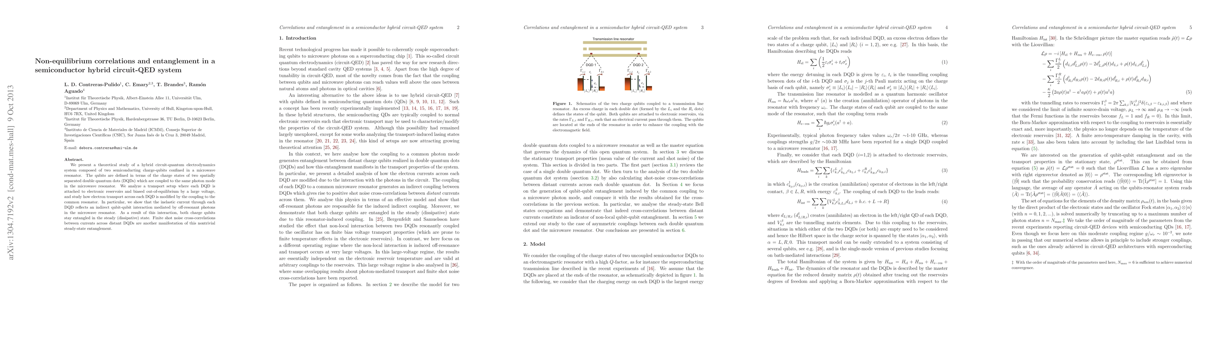 This paper explores a hybrid circuit-QED system with two semiconducting charge-qubits in a microwave resonator, showing that off-resonant photons mediate qubit-qubit interaction and result in steady-state entanglement and finite shot noise cross-correlations between the qubits.