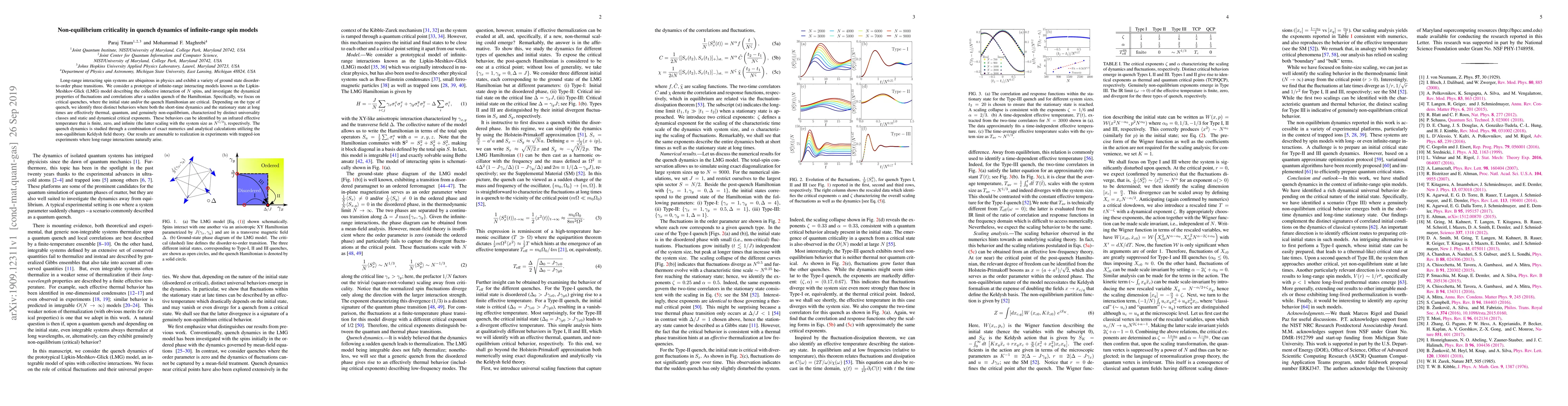 This paper investigates the dynamics of the Lipkin-Meshkov-Glick model following a sudden quench, identifying three distinct behaviors characterized by thermal, quantum, and non-equilibrium regimes. The study reveals unique universality classes and critical exponents, with an infrared effective temperature scaling to highlight these regimes.