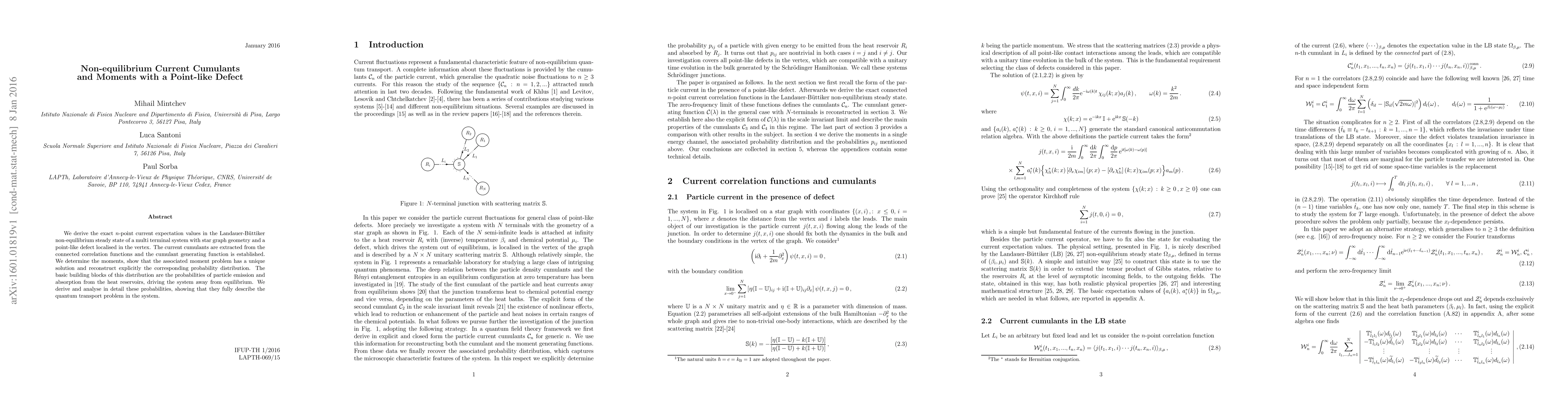 We derive the exact n-point current expectation values in the Landauer-Buttiker non-equilibrium steady state of a multi terminal system with star graph geometry and a point-like defect localised in the vertex. The current cumulants are extracted from the connected correlation functions and the cumulant generating function is established. We determine the moments, show that the associated moment problem has a unique solution and reconstruct explicitly the corresponding probability distribution. The basic building blocks of this distribution are the probabilities of particle emission and absorption from the heat reservoirs, driving the system away from equilibrium. We derive and analyse in detail these probabilities, showing that they fully describe the quantum transport problem in the system.
