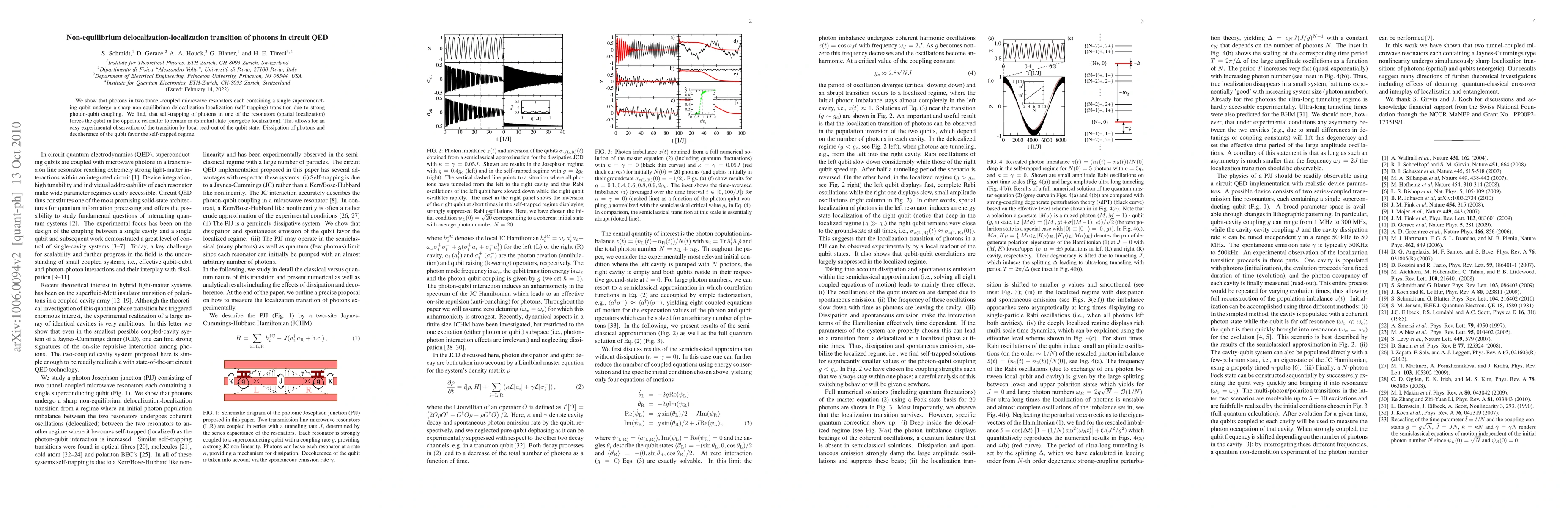 We show that photons in two tunnel-coupled microwave resonators each containing a single superconduct- ing qubit undergo a sharp non-equilibrium delocalization-localization (self-trapping) transition due to strong photon-qubit coupling. We find that dissipation favors the self-trapped regime and leads to the possibility of observing the transition as a function of time without tuning any parameter of the system. Furthermore, we find that self-trapping of photons in one of the resonators (spatial localization) forces the qubit in the opposite resonator to remain in its initial state (energetic localization). This allows for an easy experimental observation of the transition by local read-out of the qubit state.