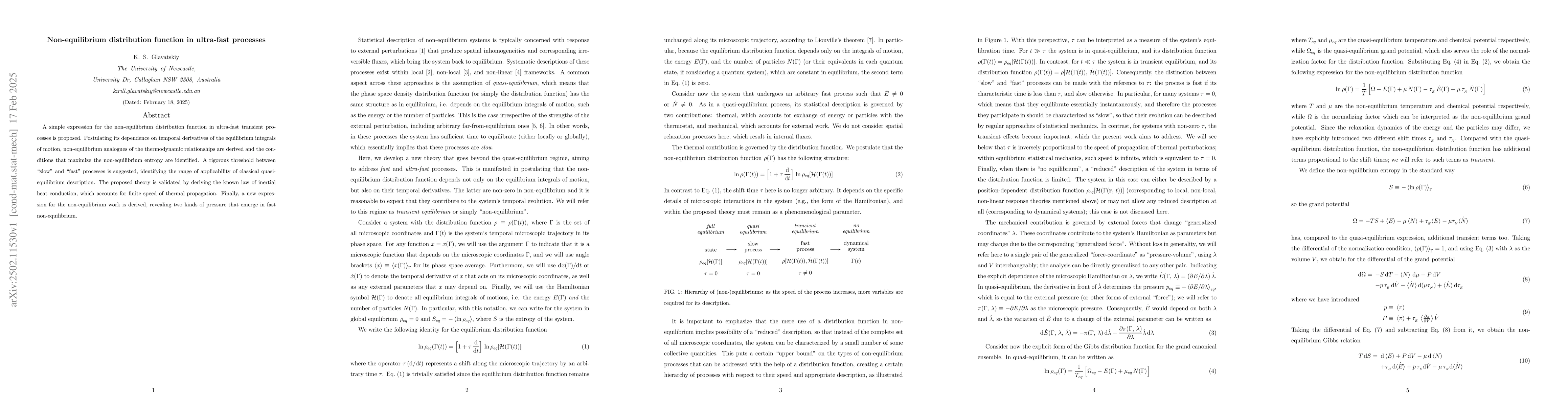 This paper proposes a simple expression for the non-equilibrium distribution function in ultra-fast processes, deriving non-equilibrium thermodynamic relationships and identifying conditions that maximize non-equilibrium entropy. It suggests a threshold distinguishing "slow" and "fast" processes and validates the theory by deriving the law of inertial heat conduction, also introducing new expressions for non-equilibrium work and two kinds of pressure in fast processes.
