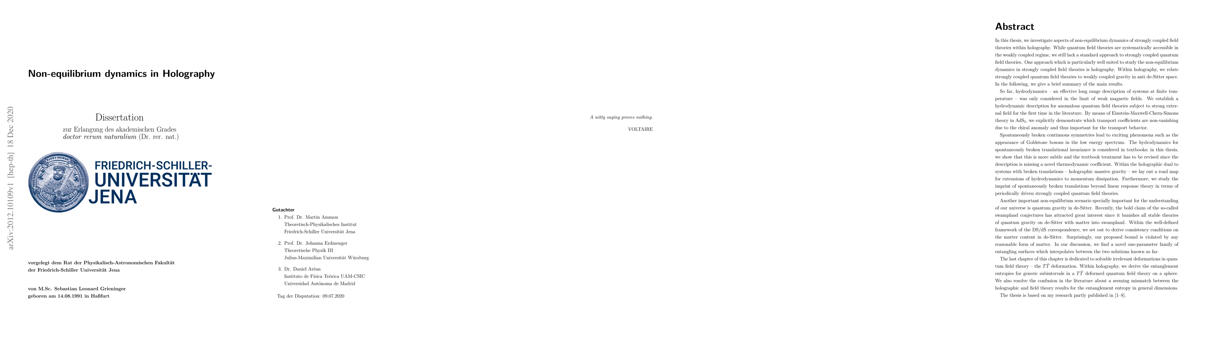 This paper explores non-equilibrium dynamics in holography, deriving hydrodynamic descriptions for strongly coupled field theories under strong external fields and studying the implications of spontaneously broken translations in de-Sitter space.
