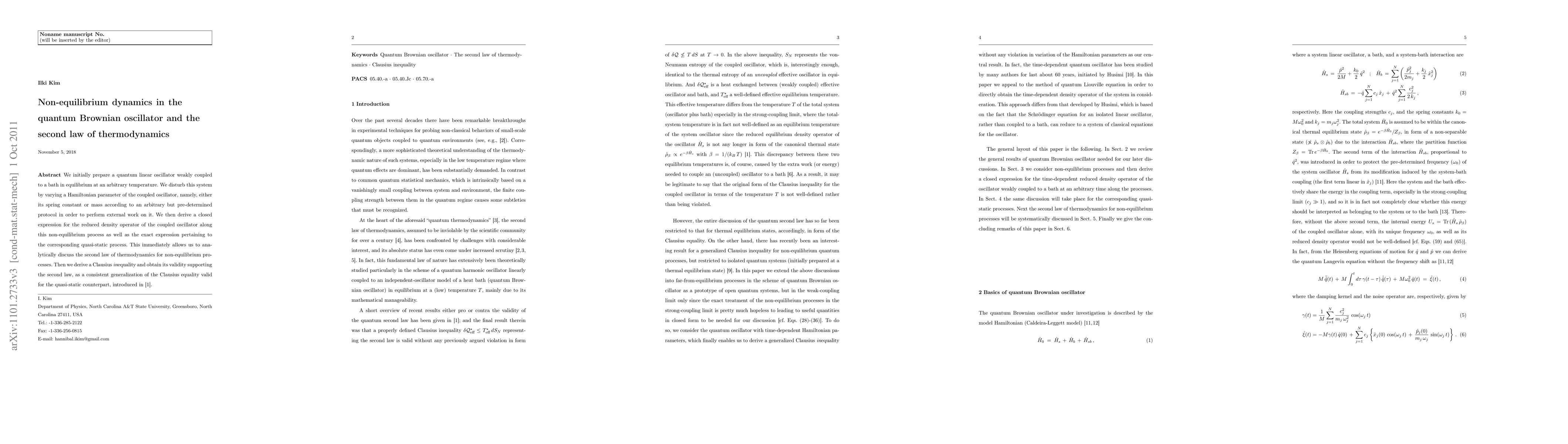 We initially prepare a quantum linear oscillator weakly coupled to a bath in equilibrium at an arbitrary temperature. We disturb this system by varying a Hamiltonian parameter of the coupled oscillator, namely, either its spring constant or mass according to an arbitrary but pre-determined protocol in order to perform external work on it. We then derive a closed expression for the reduced density operator of the coupled oscillator along this non-equilibrium process as well as the exact expression pertaining to the corresponding quasi-static process. This immediately allows us to analytically discuss the second law of thermodynamics for non-equilibrium processes. Then we derive a Clausius inequality and obtain its validity supporting the second law, as a consistent generalization of the Clausius equality valid for the quasi-static counterpart, introduced in [1].