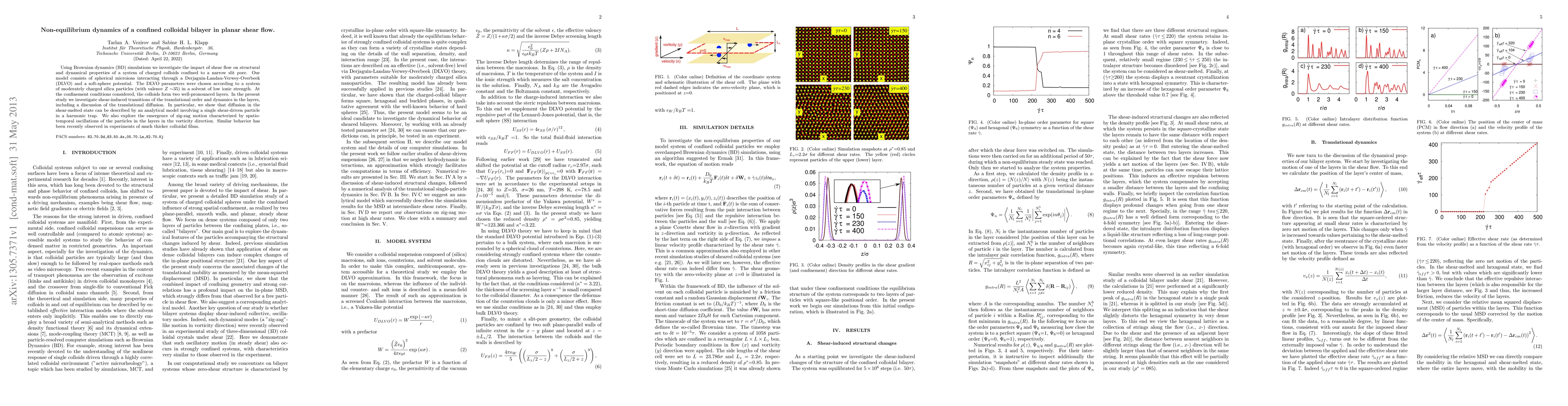 Using Brownian dynamics (BD) simulations we investigate the impact of shear flow on structural and dynamical properties of a system of charged colloids confined to a narrow slit pore. Our model consists of spherical microions interacting through a Derjaguin-Landau-Verwey-Overbeek (DLVO) and a soft-sphere potential. The DLVO parameters were chosen according to a system of moderately charged silica particles (with valence Z$\sim$35) in a solvent of low ionic strength. At the confinement conditions considered, the colloids form two well-pronounced layers. In the present study we investigate shear-induced transitions of the translational order and dynamics in the layers, including a discussion of the translational diffusion. In particular, we show that diffusion in the shear-melted state can be described by an analytical model involving a single shear-driven particle in a harmonic trap. We also explore the emergence of zig-zag motion characterized by spatio-temporal oscillations of the particles in the layers in the vorticity direction. Similar behavior has been recently observed in experiments of much thicker colloidal films.