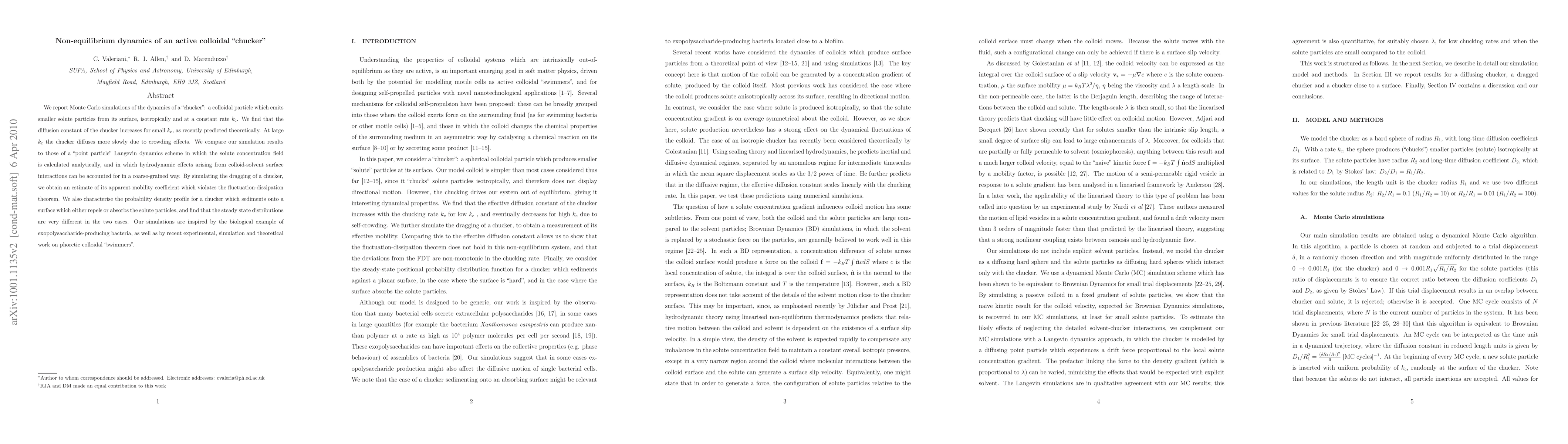 We report Monte Carlo simulations of the dynamics of a "chucker": a colloidal particle which emits smaller solute particles from its surface, isotropically and at a constant rate k_c. We find that the diffusion constant of the chucker increases for small k_c, as recently predicted theoretically. At large k_c the chucker diffuses more slowly due to crowding effects. We compare our simulation results to those of a "point particle" Langevin dynamics scheme in which the solute concentration field is calculated analytically, and in which hydrodynamic effects can be included albeit in an approximate way. By simulating the dragging of a chucker, we obtain an estimate of its apparent mobility coefficient which violates the fluctuation-dissipation theorem. We also characterise the probability density profile for a chucker which sediments onto a surface which either repels or absorbs the solute particles, and find that the steady state distributions are very different in the two cases. Our simulations are inspired by the biological example of exopolysaccharide-producing bacteria, as well as by recent experimental, simulation and theoretical work on phoretic colloidal "swimmers".