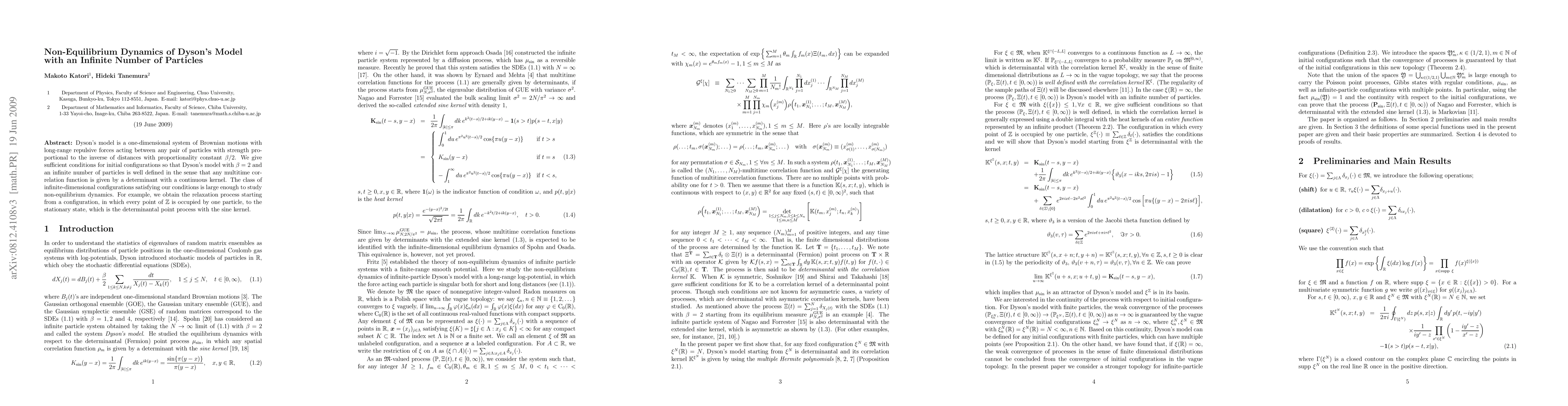 Dyson's model is a one-dimensional system of Brownian motions with long-range repulsive forces acting between any pair of particles with strength proportional to the inverse of distances with proportionality constant $\beta/2$. We give sufficient conditions for initial configurations so that Dyson's model with $\beta=2$ and an infinite number of particles is well defined in the sense that any multitime correlation function is given by a determinant with a continuous kernel. The class of infinite-dimensional configurations satisfying our conditions is large enough to study non-equilibrium dynamics. For example, we obtain the relaxation process starting from a configuration, in which every point of $\Z$ is occupied by one particle, to the stationary state, which is the determinantal point process with the sine kernel.