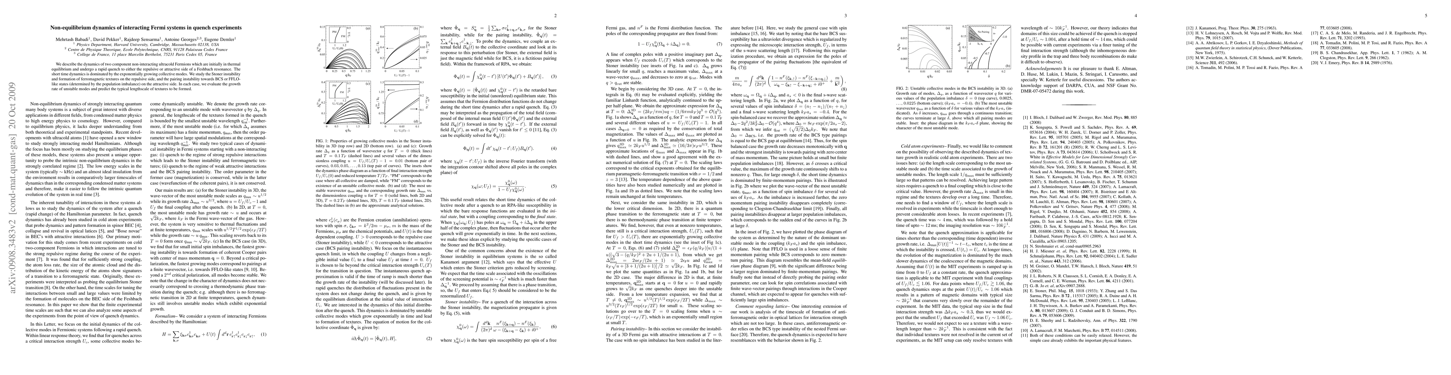 This paper investigates the dynamics of ultracold Fermions undergoing rapid quenches across a Feshbach resonance, focusing on the growth of collective modes and instabilities leading to ferromagnetic textures on the repulsive side and pairing instabilities towards BCS or FFLO states on the attractive side. The study evaluates the growth rates and predicts the lengthscale of formed textures.