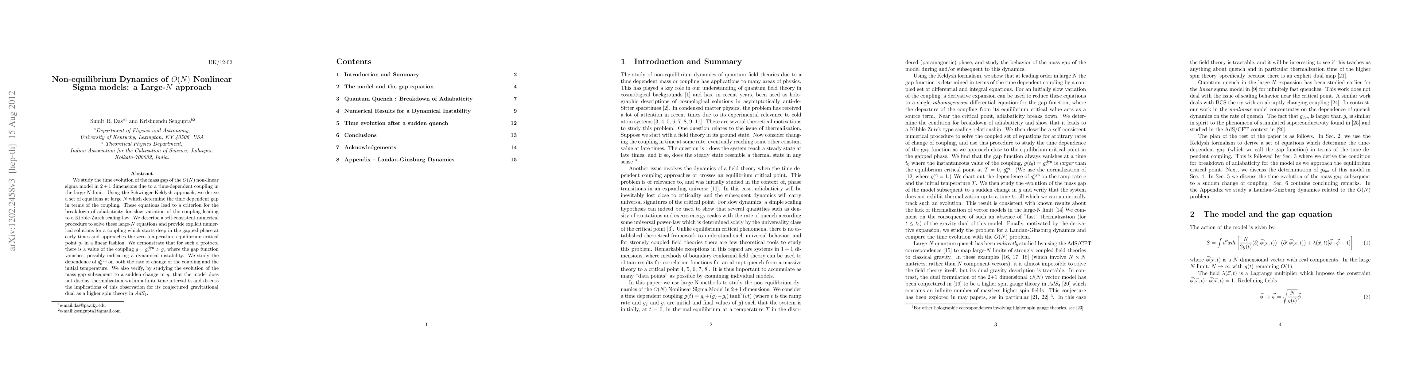 We study the time evolution of the mass gap of the O(N) non-linear sigma model in 2+1 dimensions due to a time-dependent coupling in the large-$N$ limit. Using the Schwinger-Keldysh approach, we derive a set of equations at large $N$ which determine the time dependent gap in terms of the coupling. These equations lead to a criterion for the breakdown of adiabaticity for slow variation of the coupling leading to a Kibble-Zurek scaling law. We describe a self-consistent numerical procedure to solve these large-$N$ equations and provide explicit numerical solutions for a coupling which starts deep in the gapped phase at early times and approaches the zero temperature equilibrium critical point $g_c$ in a linear fashion. We demonstrate that for such a protocol there is a value of the coupling $g= g_c^{\rm dyn}> g_c$ where the gap function vanishes, possibly indicating a dynamical instability. We study the dependence of $g_c^{\rm dyn}$ on both the rate of change of the coupling and the initial temperature. We also verify, by studying the evolution of the mass gap subsequent to a sudden change in $g$, that the model does not display thermalization within a finite time interval $t_0$ and discuss the implications of this observation for its conjectured gravitational dual as a higher spin theory in $AdS_4$.