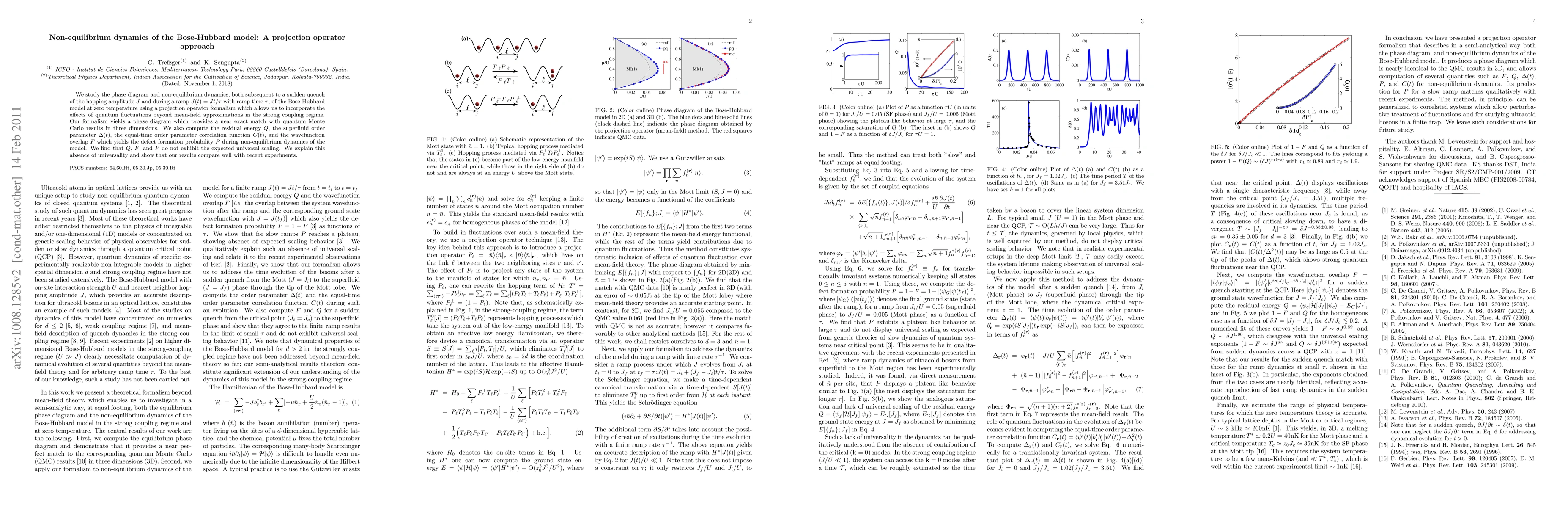 This paper investigates the non-equilibrium dynamics of the Bose-Hubbard model using a projection operator formalism, revealing a phase diagram that closely matches quantum Monte Carlo results. It finds deviations from expected universal scaling in residual energy, wavefunction overlap, and defect formation probability, aligning with recent experimental observations.
