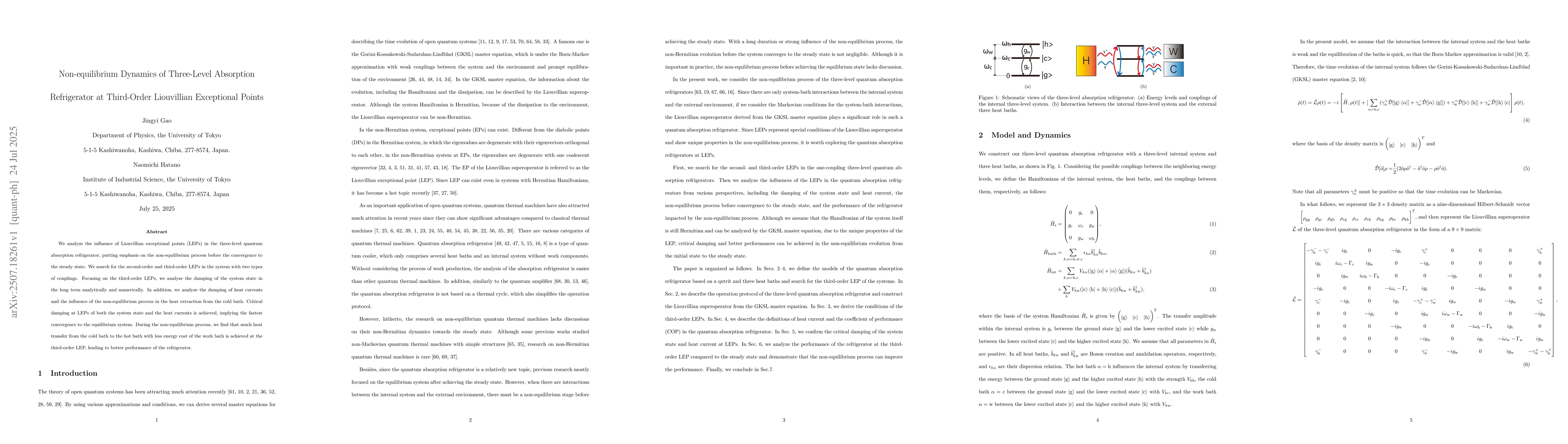We analyze the influence of Liouvillian exceptional points (LEPs) in the three-level quantum absorption refrigerator, putting emphasis on the non-equilibrium process before the convergence to the steady state. We search for the second-order and third-order LEPs in the system with two types of couplings. Focusing on the third-order LEPs, we analyze the damping of the system state in the long term analytically and numerically. In addition, we analyze the damping of heat currents and the influence of the non-equilibrium process in the heat extraction from the cold bath. Critical damping at LEPs of both the system state and the heat currents is achieved, implying the fastest convergence to the equilibrium system. During the non-equilibrium process, we find that much heat transfer from the cold bath to the hot bath with less energy cost of the work bath is achieved at the third-order LEP, leading to better performance of the refrigerator.