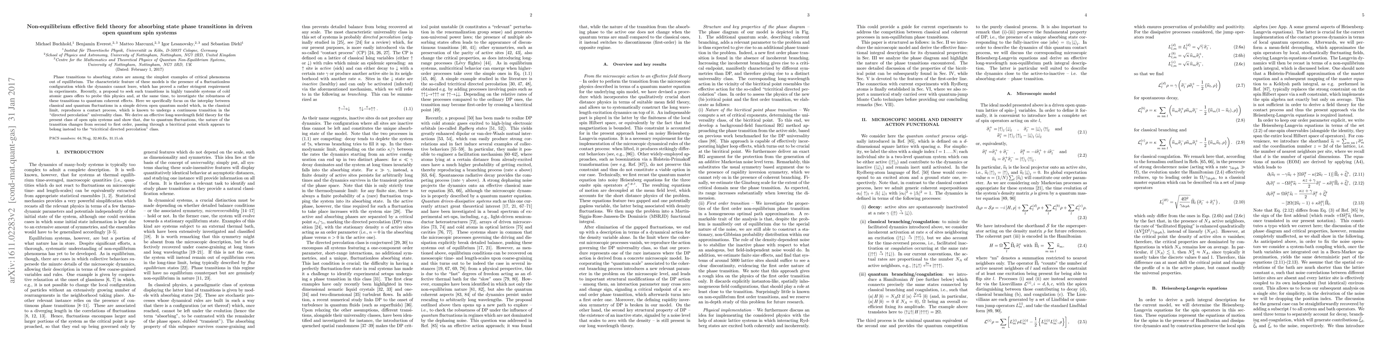 This paper develops an effective field theory for driven open quantum spin systems undergoing phase transitions to absorbing states, revealing that quantum fluctuations can transform the transition from second to first order, introducing a bicritical point in the "tricritical directed percolation" class. The study highlights the interplay between classical and quantum fluctuations in these systems.