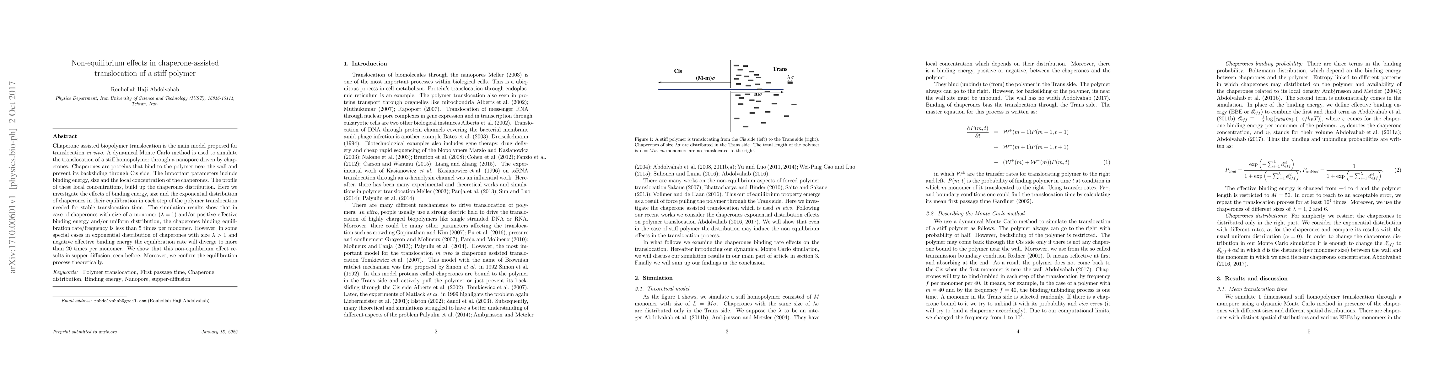 This paper uses a dynamical Monte Carlo method to simulate chaperone-assisted translocation of a stiff polymer through a nanopore, focusing on the effects of chaperone binding energy, size, and distribution. The study finds that non-equilibrium effects in chaperone equilibration can lead to super diffusion, especially when chaperones have sizes greater than a monomer and negative binding energy.