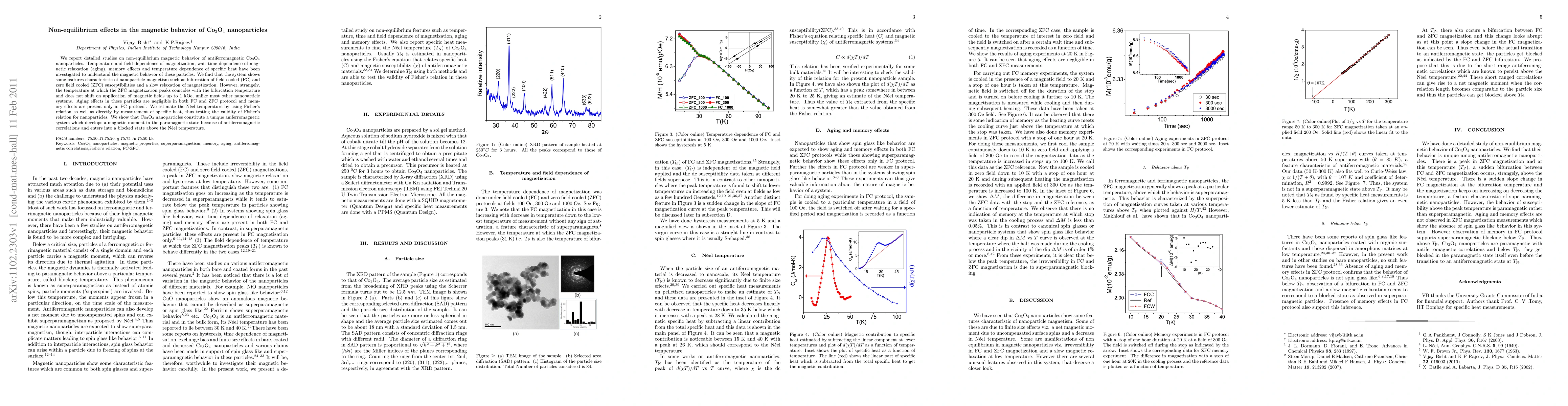 This study investigates the non-equilibrium magnetic behavior of Co₃O₄ nanoparticles, finding unique features such as coincident bifurcation temperature and peak in zero field cooled magnetization, negligible aging effects, and the presence of memory effects only in field cooled protocol. The research also verifies the N\'eel temperature through specific heat measurement and Fisher's relation.