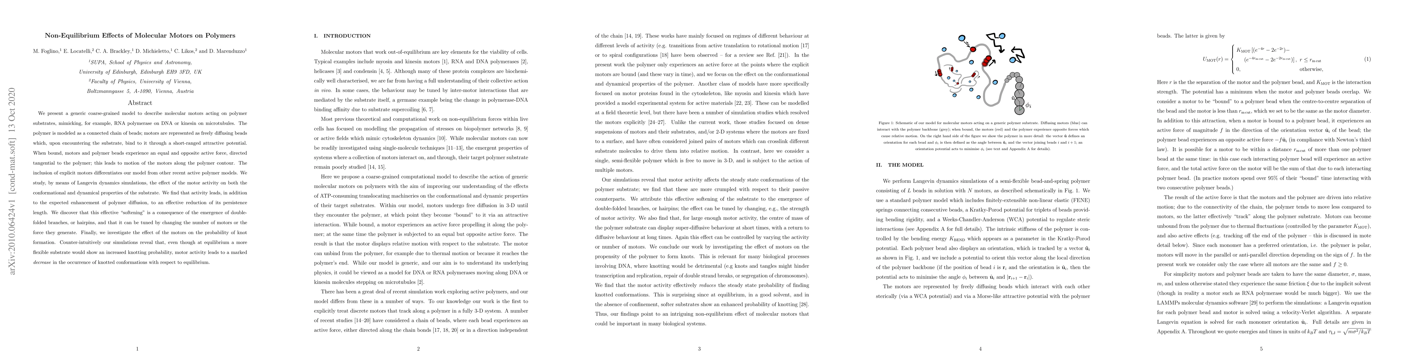 We present a generic coarse-grained model to describe molecular motors acting on polymer substrates, mimicking, for example, RNA polymerase on DNA or kinesin on microtubules. The polymer is modeled as a connected chain of beads; motors are represented as freely diffusing beads which, upon encountering the substrate, bind to it through a short-ranged attractive potential. When bound, motors and polymer beads experience an equal and opposite active force, directed tangential to the polymer; this leads to motion of the motors along the polymer contour. The inclusion of explicit motors differentiates our model from other recent active polymer models. We study, by means of Langevin dynamics simulations, the effect of the motor activity on both the conformational and dynamical properties of the substrate. We find that activity leads, in addition to the expected enhancement of polymer diffusion, to an effective reduction of its persistence length. We discover that this effective "softening" is a consequence of the emergence of double-folded branches, or hairpins, and that it can be tuned by changing the number of motors or the force they generate. Finally, we investigate the effect of the motors on the probability of knot formation. Counter-intuitively our simulations reveal that, even though at equilibrium a more flexible substrate would show an increased knotting probability, motor activity leads to a marked decrease in the occurrence of knotted conformations with respect to equilibrium.