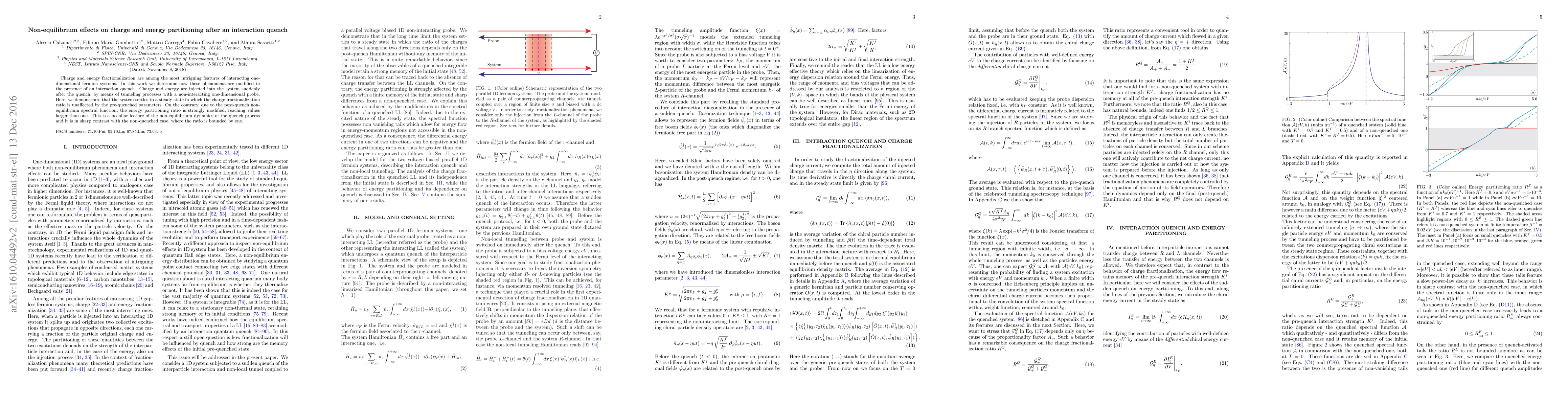 This paper investigates how charge and energy fractionalization in one-dimensional fermion systems change after an interaction quench, showing that while charge remains unaffected, energy partitioning is significantly altered due to nonequilibrium dynamics, leading to ratios exceeding one.