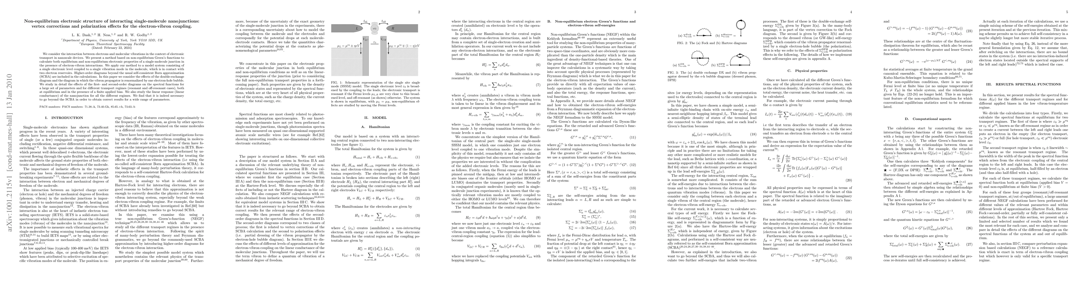 We consider the interaction between electrons and molecular vibrations in the context of electronic transport in nanoscale devices. We present a method based on non-equilibrium Green's functions to calculate both equilibrium and non-equilibrium electronic properties of a single-molecule junction in the presence of electron-vibron interactions. We apply our method to a model system consisting of a single electronic level coupled to a single vibration mode in the molecule, which is in contact with two electron reservoirs. Higher-order diagrams beyond the usual self-consistent Born approximation (SCBA) are included in the calculations. In this paper we consider the effects of the double-exchange diagram and the diagram in which the vibron propagator is renormalized by one electron-hole bubble. We study in detail the effects of the first- and second-order diagrams on the spectral functions for a large set of parameters and for different transport regimes (resonant and off-resonant cases), both at equilibrium and in the presence of a finite applied bias. We also study the linear response (linear conductance) of the nanojunction for all the different regimes. We find that it is indeed necessary to go beyond the SCBA in order to obtain correct results for a wide range of parameters.