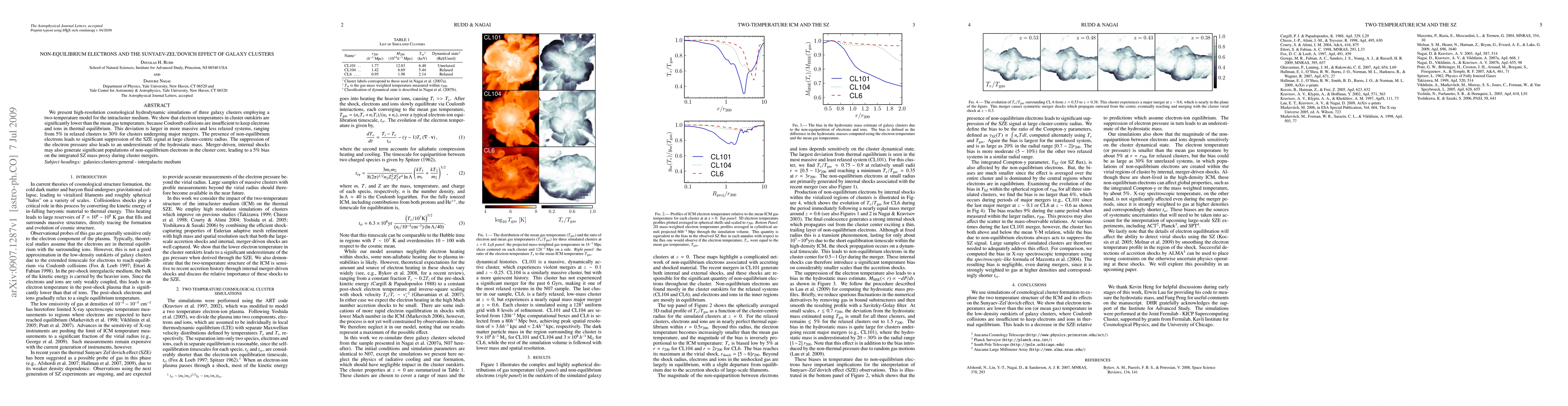 We present high-resolution cosmological hydrodynamic simulations of three galaxy clusters employing a two-temperature model for the intracluster medium. We show that electron temperatures in cluster outskirts are significantly lower than the mean gas temperature, because Coulomb collisions are insufficient to keep electrons and ions in thermal equilibrium. This deviation is larger in more massive and less relaxed systems, ranging from 5% in relaxed clusters to 30% for clusters undergoing major mergers. The presence of non-equilibrium electrons leads to significant suppression of the SZE signal at large cluster-centric radius. The suppression of the electron pressure also leads to an underestimate of the hydrostatic mass. Merger-driven, internal shocks may also generate significant populations of non-equilibrium electrons in the cluster core, leading to a 5% bias on the integrated SZ mass proxy during cluster mergers.
