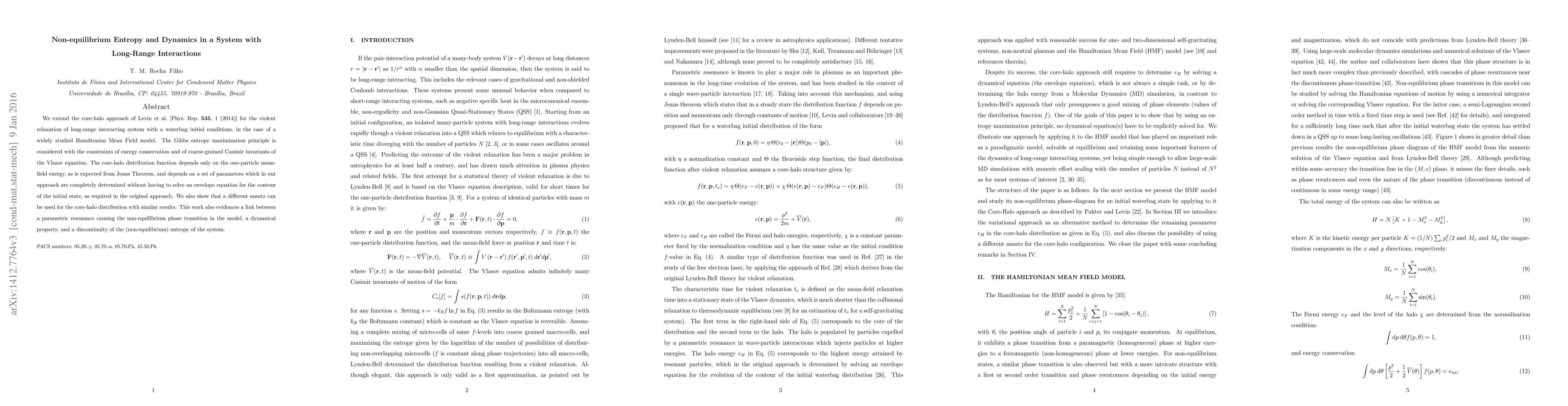 A study revisits the core-halo approach for non-equilibrium dynamics in a long-range interacting system, introducing an alternative distribution function with comparable results, and revealing a link between parametric resonance and entropy discontinuity.