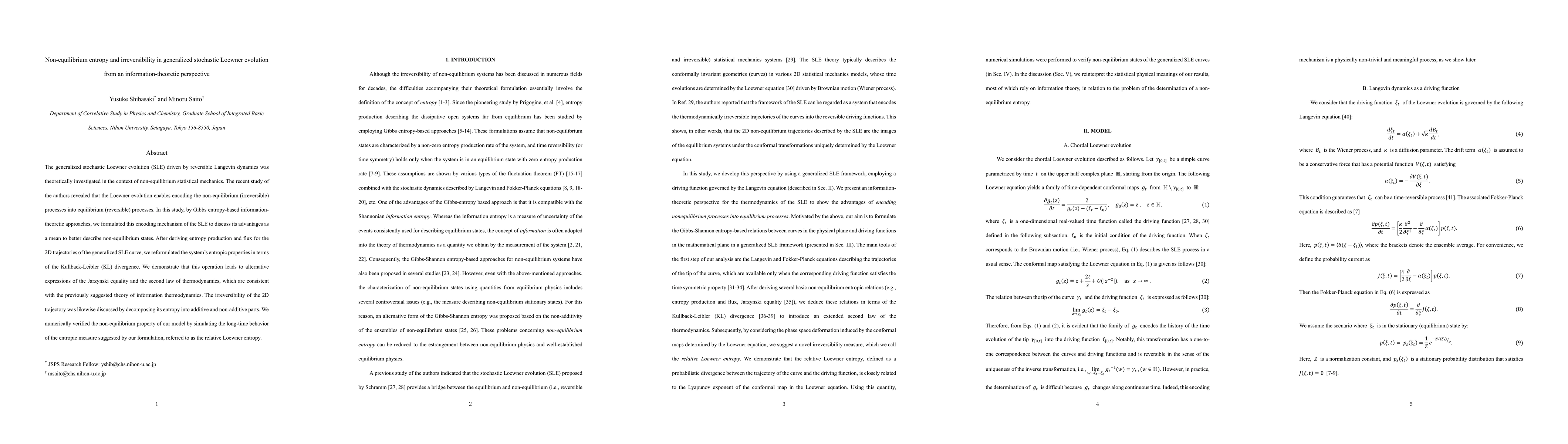 This paper explores the generalized stochastic Loewner evolution (SLE) through an information-theoretic lens to better describe non-equilibrium processes. The authors reformulate entropy production and flux in terms of the Kullback-Leibler divergence, demonstrating consistency with information thermodynamics and providing a new perspective on irreversibility.