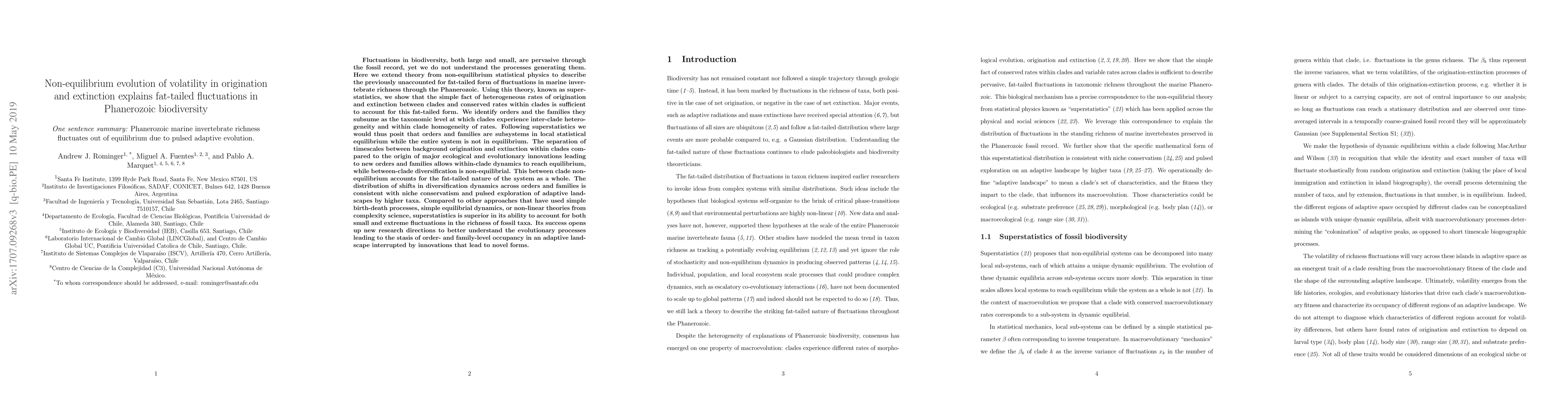 Fluctuations in biodiversity, large and small, are pervasive in the fossil record, yet we do not understand the processes generating them. Here we extend theory from non-equilibrium statistical physics to describe the previously unaccounted for fat-tailed form of fluctuations in marine invertebrate richness through the Phanerozoic. Using this theory, known as superstatistics, we show that the simple fact of heterogeneous origination and extinction rates between clades and conserved rates within clades is sufficient to account for this fat-tailed form. We identify orders and the families they subsume as the taxonomic level at which clades experience inter-clade heterogeneity and within clade homogeneity of rates. Following superstatistics we would posit that orders and families are subsystems in local statistical equilibrium while the entire system is not in equilibrium. The separation of timescales between background origination and extinction within clades compared to the origin of major ecological and evolutionary innovations leading to new clades allows within-clade dynamics to reach equilibrium, while between-clade diversification is non-equilibrial. This between clade non-equilibrium accounts for the fat-tailed nature of the system as a whole. The distribution of shifts in diversification dynamics across orders and families is consistent with niche conservatism and pulsed exploration of adaptive landscapes by higher taxa. Compared to other approaches that have used simple birth-death processes, simple equilibrial dynamics, or non-linear theories from complexity science, superstatistics is superior in its ability to account for both small and extreme fluctuations in the richness of fossil taxa. Its success opens up new research directions to better understand the evolutionary processes leading to stasis in an adaptive landscape interrupted by innovations that lead to novel forms.