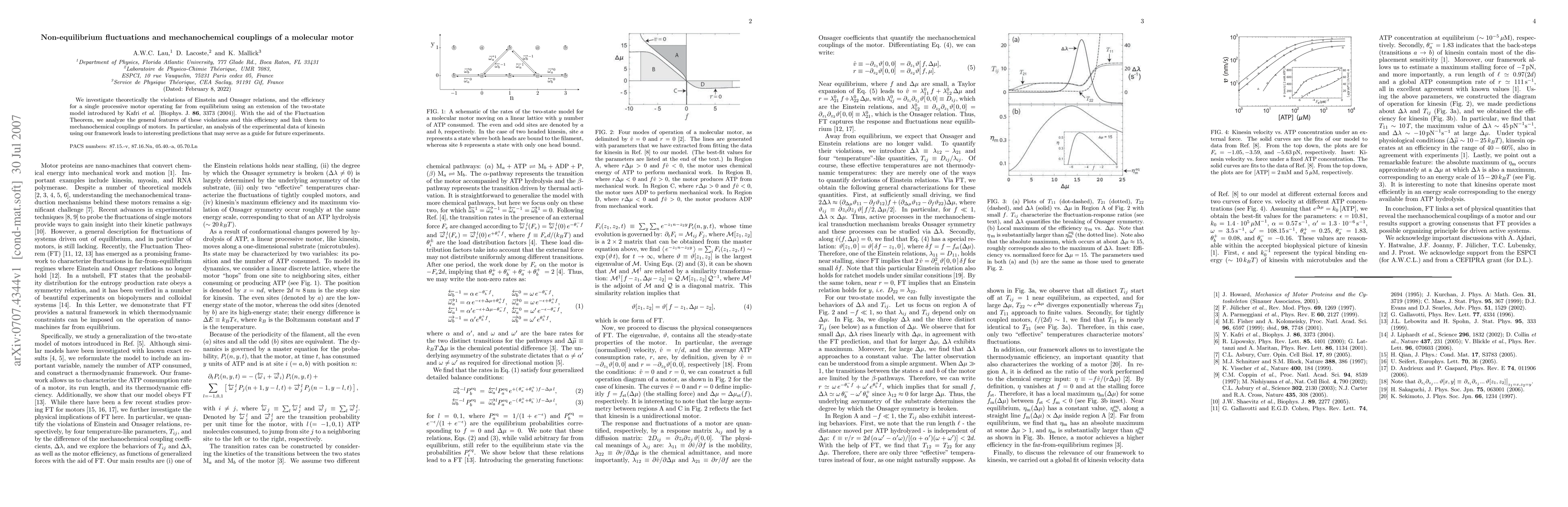This paper theoretically explores the deviations from Einstein and Onsager relations and motor efficiency for a non-equilibrium molecular motor, extending a two-state model. It uses the Fluctuation Theorem to link these violations to mechanochemical couplings and provides predictions for kinesin that could guide future experiments.