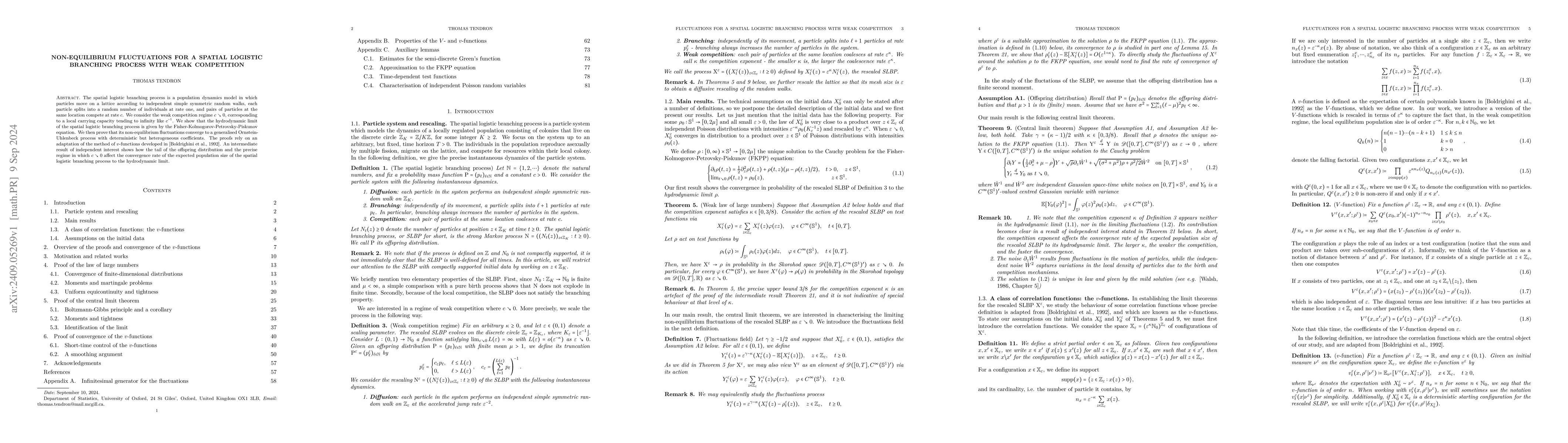 This paper studies the spatial logistic branching process under weak competition, showing its hydrodynamic limit converges to the Fisher-Kolmogorov-Petrovsky-Piskunov equation. It also demonstrates that non-equilibrium fluctuations converge to a generalised Ornstein-Uhlenbeck process with heterogeneous coefficients, leveraging an adaptation of v-functions.