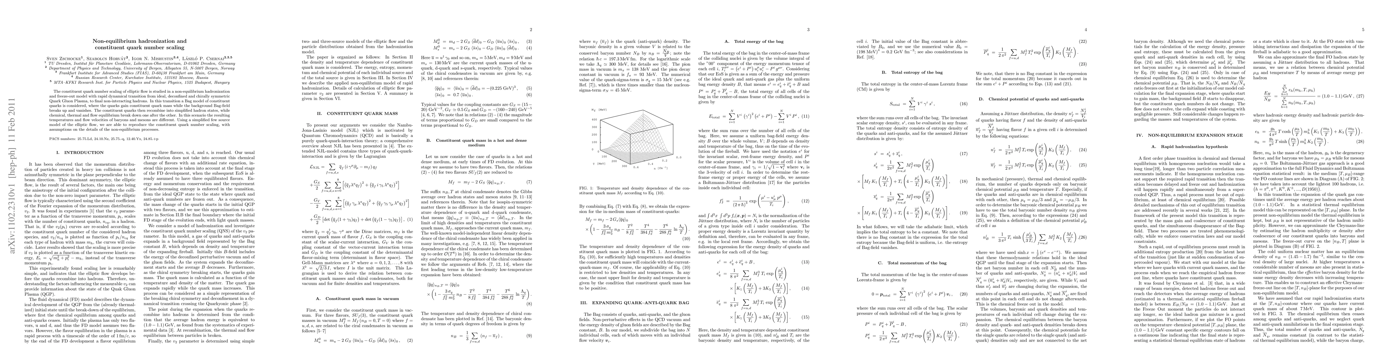 This paper investigates the constituent quark number scaling of elliptic flow in a non-equilibrium hadronization model transitioning from a Quark Gluon Plasma to non-interacting hadrons. The study employs a Bag model to describe the mass gain of constituent quarks and their recombination into hadrons, revealing differing temperatures and flow velocities for baryons and mesons.