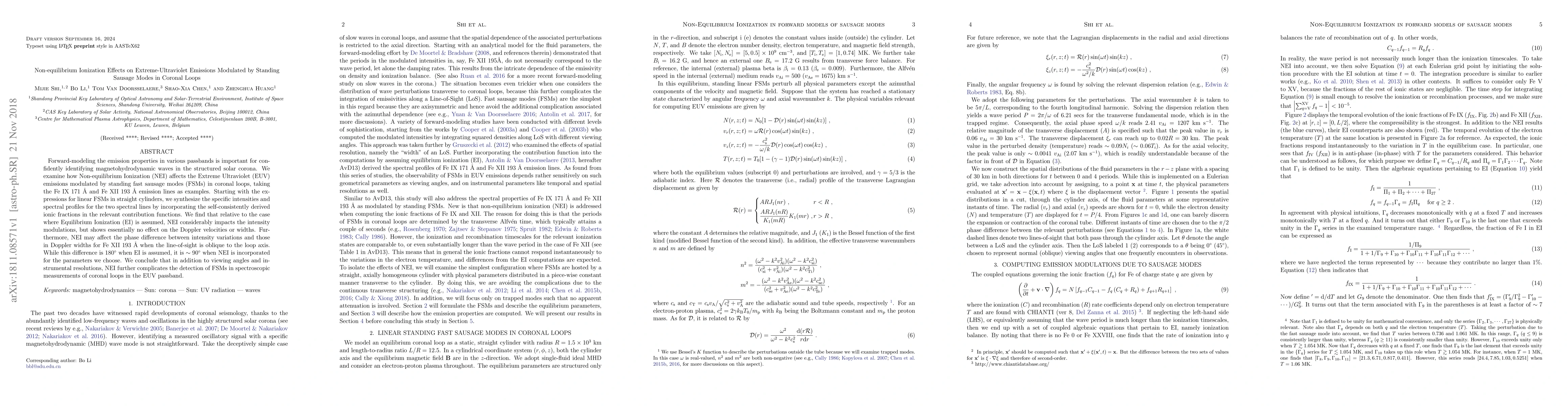 This study investigates how Non-equilibrium Ionization (NEI) influences Extreme Ultraviolet (EUV) emissions modulated by standing fast sausage modes in coronal loops, using Fe IX and Fe XII lines as examples. NEI significantly alters intensity modulations compared to Equilibrium Ionization but does not affect Doppler velocities or widths, complicating the detection of these modes in spectroscopic measurements.
