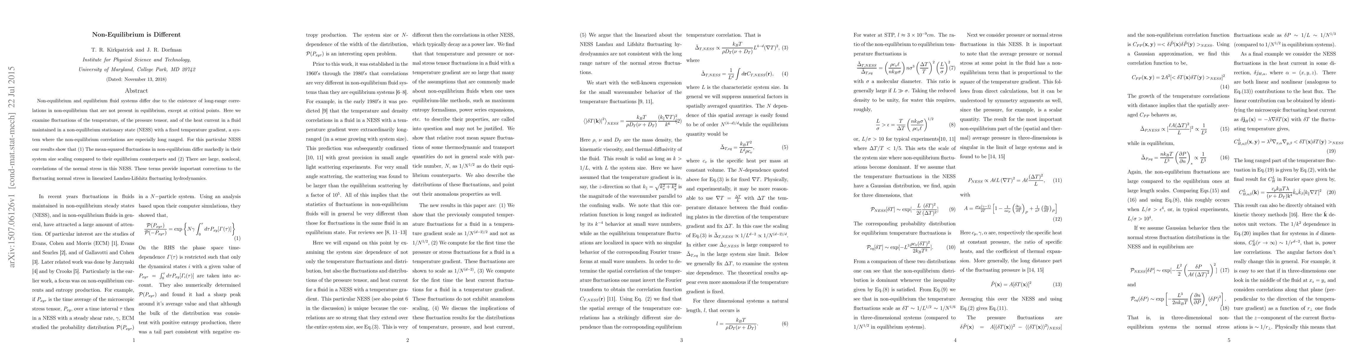 Non-equilibrium and equilibrium fluid systems differ due to the existence of long-range correlations in non-equilibrium that are not present in equilibrium, except at critical points. Here we examine fluctuations of the temperature, of the pressure tensor, and of the heat current in a fluid maintained in a non-equilibrium stationary state (NESS) with a fixed temperature gradient, a system where the non-equilibrium correlations are especially long ranged. For this particular NESS our results show that (1) The mean-squared fluctuations in non-equilibrium differ markedly in their system size scaling compared to their equilibrium counterparts and (2) There are large, nonlocal, correlations of the normal stress in this NESS. These terms provide important corrections to the fluctuating normal stress in linearized Landau-Lifshitz fluctuating hydrodynamics.