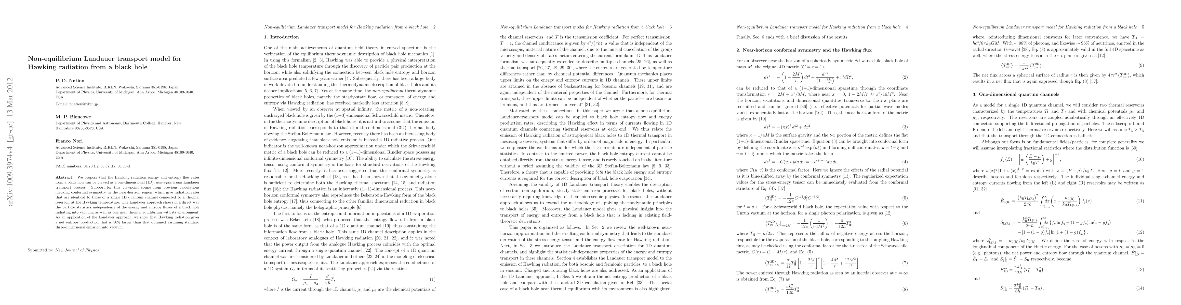This paper proposes a non-equilibrium Landauer transport model to describe Hawking radiation from a black hole, showing that its energy and entropy flow rates mirror a one-dimensional quantum channel connected to a thermal reservoir. The model demonstrates independence of particle statistics for black hole radiation and predicts a net entropy production 50% larger than traditional three-dimensional models.