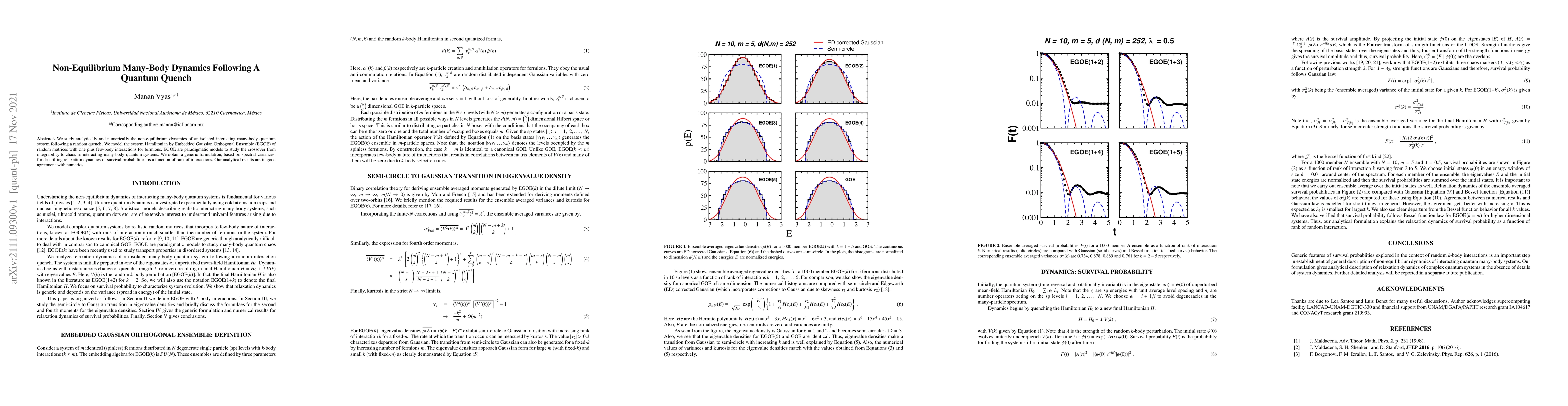 We study analytically and numerically the non-equilibrium dynamics of an isolated interacting many-body quantum system following a random quench. We model the system Hamiltonian by Embedded Gaussian Orthogonal Ensemble (EGOE) of random matrices with one plus few-body interactions for fermions. EGOE are paradigmatic models to study the crossover from integrability to chaos in interacting many-body quantum systems. We obtain a generic formulation, based on spectral variances, for describing relaxation dynamics of survival probabilities as a function of rank of interactions. Our analytical results are in good agreement with numerics.