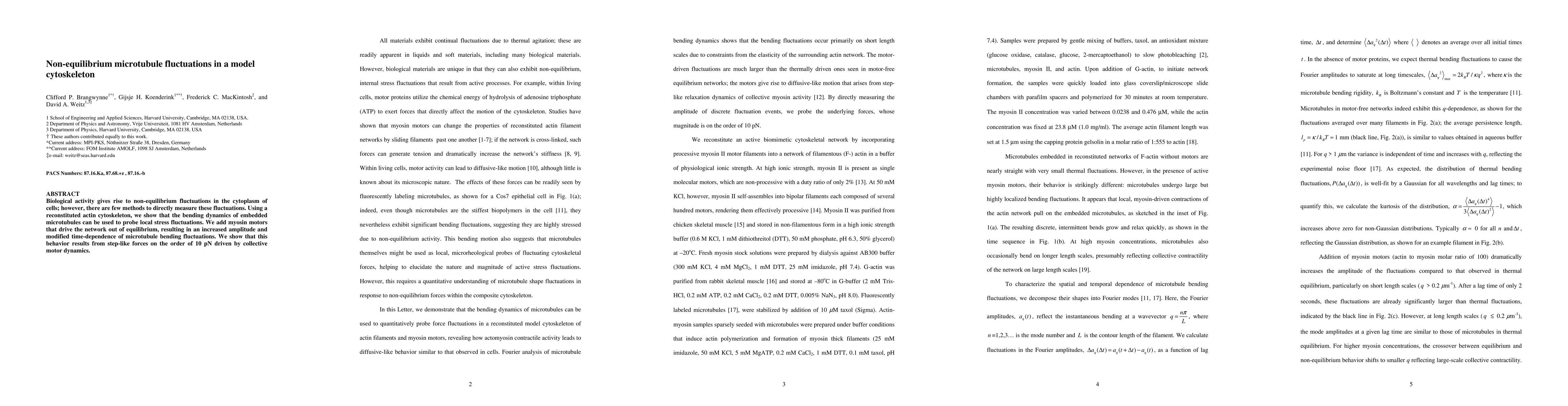 This study demonstrates that microtubule bending dynamics in a reconstituted actin cytoskeleton can reveal non-equilibrium fluctuations induced by myosin motors, showing increased fluctuation amplitude and altered time-dependence due to collective motor-driven forces around 10 pN. This method provides insight into local stress fluctuations in cellular cytoplasm.