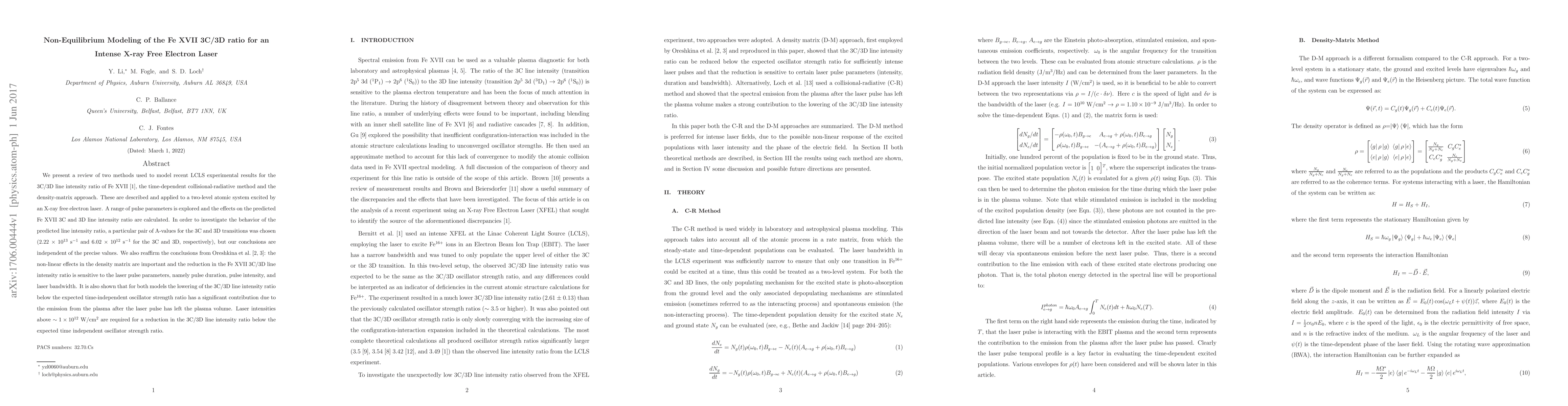 Two time-dependent methods have been used to model the Fe XVII 3C/3D line intensity ratio for an intense laser field: the C-R approach and the D-M approach.