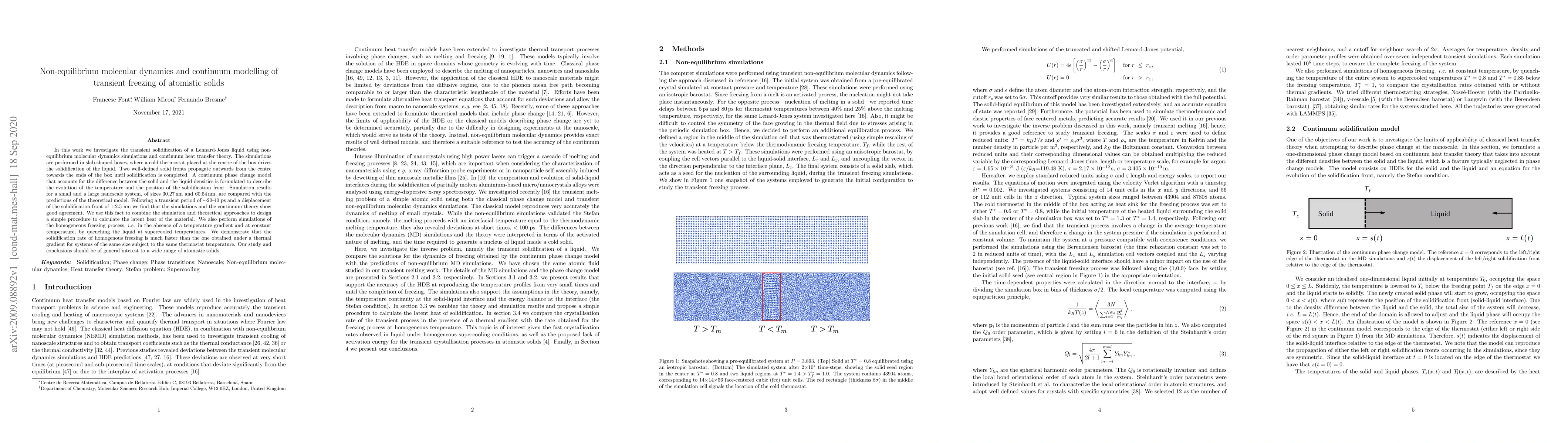 In this work we investigate the transient solidification of a Lennard-Jones liquid using non-equilibrium molecular dynamics simulations and continuum heat transfer theory. The simulations are performed in slab-shaped boxes, where a cold thermostat placed at the centre of the box drives the solidification of the liquid. Two well-defined solid fronts propagate outwards from the centre towards the ends of the box until solidification is completed. A continuum phase change model that accounts for the difference between the solid and the liquid densities is formulated to describe the evolution of the temperature and the position of the solidification front. Simulation results for a small and a large nanoscale system, of sizes $30.27$\,nm and $60.54$\,nm, are compared with the predictions of the theoretical model. Following a transient period of $\sim$20-40 ps and a displacement of the solidification front of 1-2.5 nm we find that the simulations and the continuum theory show good agreement. We use this fact to combine the simulation and theoretical approaches to design a simple procedure to calculate the latent heat of the material. We also perform simulations of the homogeneous freezing process, i.e. in the absence of a temperature gradient and at constant temperature, by quenching the liquid at supercooled temperatures. We demonstrate that the solidification rate of homogenous freezing is much faster than the one obtained under a thermal gradient for systems of the same size subject to the same thermostat temperature. Our study and conclusions should be of general interest to a wide range of atomistic solids.