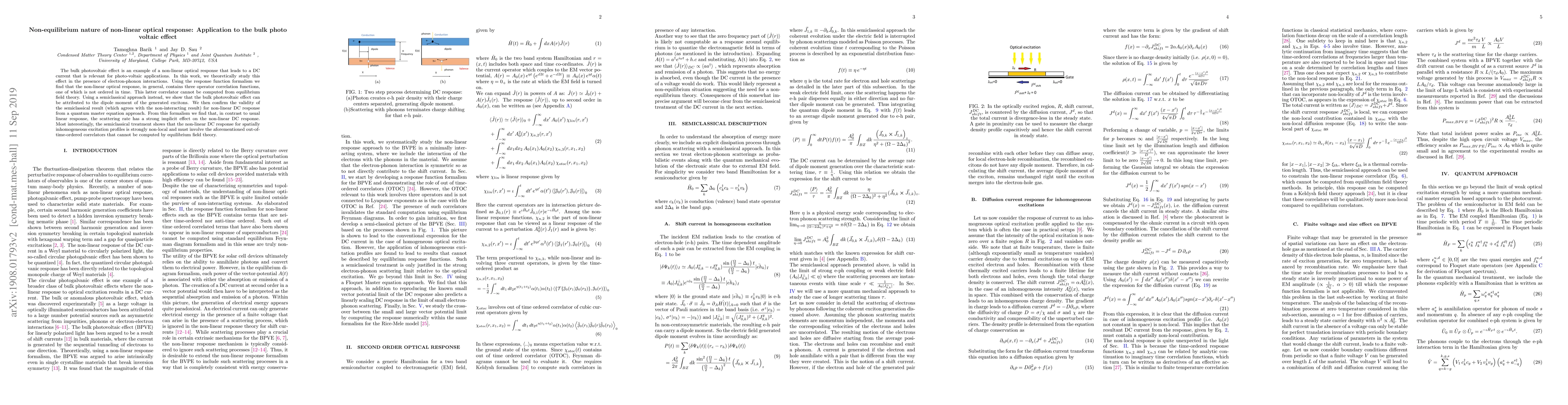 Researchers study non-linear optical response in bulk photovoltaic effect, finding it involves out-of-time-ordered correlators that cannot be computed from equilibrium field theory. The semiclassical approach shows the effect is strongly non-local and depends on scattering rates.