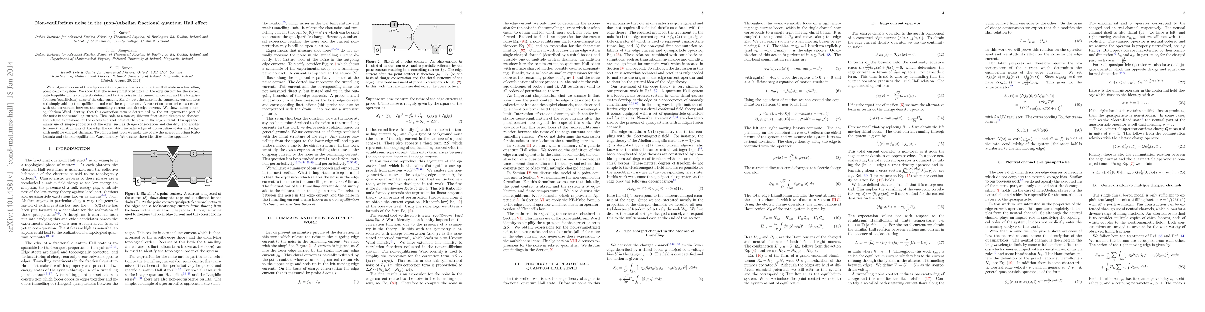 This paper investigates the noise in the edge current of fractional quantum Hall states through a tunnelling point contact, revealing that non-equilibrium noise is determined by the tunnelling current noise and equilibrium Nyquist-Johnson noise, with a correction term arising from their correlation. The study employs non-equilibrium Ward identities and the Kubo formula to derive a non-equilibrium fluctuation-dissipation theorem.
