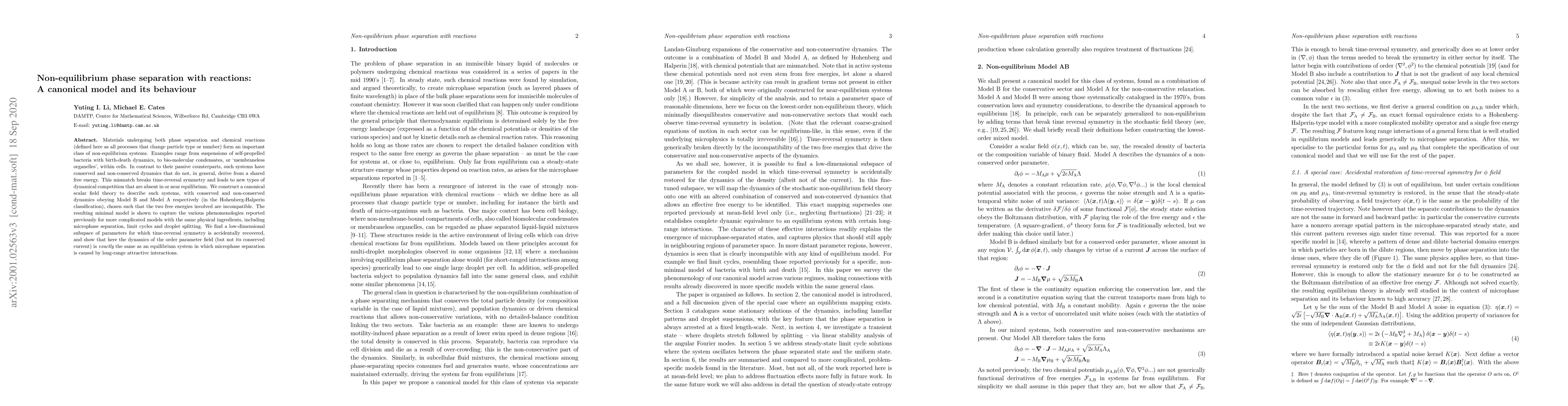 This research introduces a simplified scalar field theory to model non-equilibrium systems involving phase separation and chemical reactions, capturing phenomena like microphase separation, limit cycles, and droplet splitting. It identifies a specific parameter subspace where time-reversal symmetry is accidentally restored, making the dynamics equivalent to an equilibrium system with long-range attractive interactions.