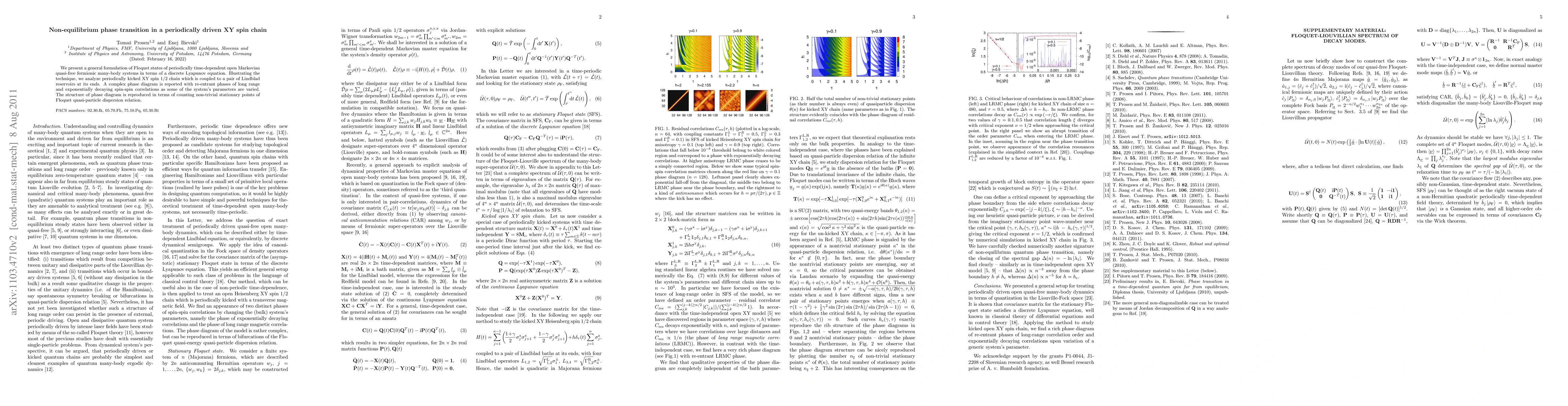 We present a general formulation of Floquet states of periodically time-dependent open Markovian quasi-free fermionic many-body systems in terms of a discrete Lyapunov equation. Illustrating the technique, we analyze periodically kicekd XY spin 1/2 chain which is coupled to a pair of Lindblad reservoirs at its ends. A complex phase diagram is reported with re-entrant phases of long range and exponentially decaying spin-spin correlations as some of the system's parameters are varied. The structure of phase diagram is reproduced in terms of counting non-trivial stationary points of Floquet quasi-particle dispersion relation.