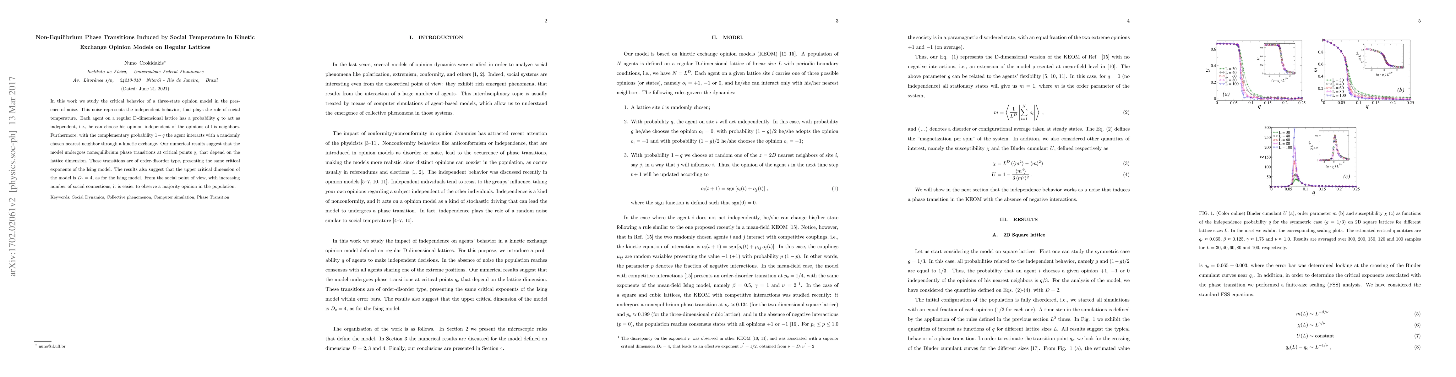 This paper investigates a three-state opinion model on regular lattices where noise, akin to social temperature, induces non-equilibrium phase transitions. The model shows order-disorder transitions with critical exponents similar to the Ising model, and the upper critical dimension is found to be $D_{c}=4$.