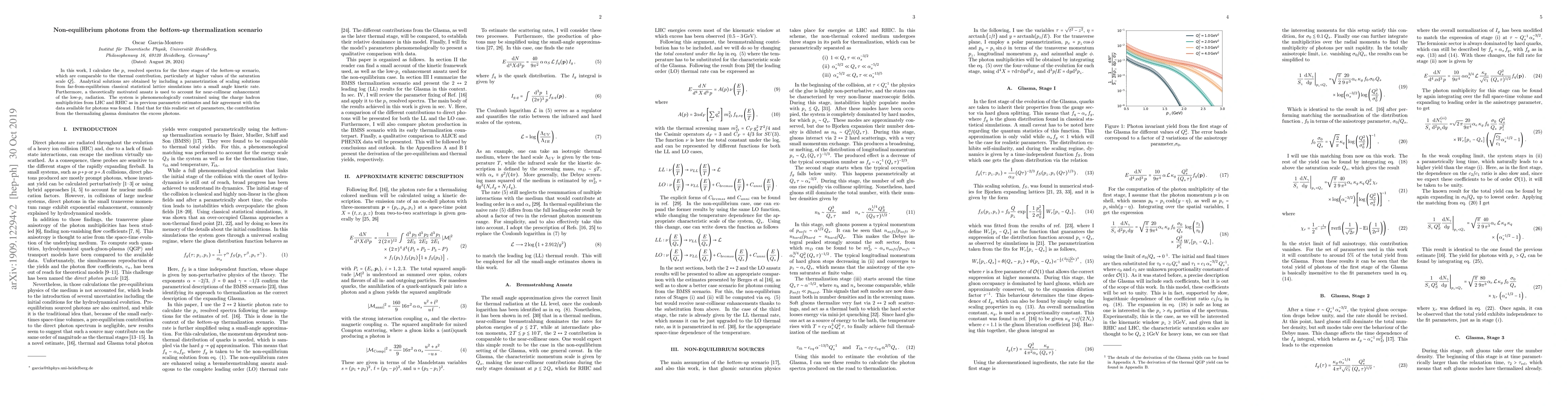 In this work, I calculate the $p_\perp$ resolved spectra for the three stages of the \textit{bottom-up} scenario, which are comparable to the thermal contribution, particularly at higher values of the saturation scale $Q_S^2$. Analytical solutions are obtained by including a parametrization of scaling solutions from far-from-equilibrium classical statistical lattice simulations into a small angle kinetic rate. Furthermore, a theoretically motivated ansatz is used to account for near-collinear enhancement of the low-$p_\perp$ radiation. The system is phenomenologically constrained using the charge hadron multiplicities from LHC and RHIC as in previous parametric estimates and fair agreement with the data available for photons was found. I find that for this realistic set of parameters, the contribution from the thermalizing glasma dominates the excess photons.