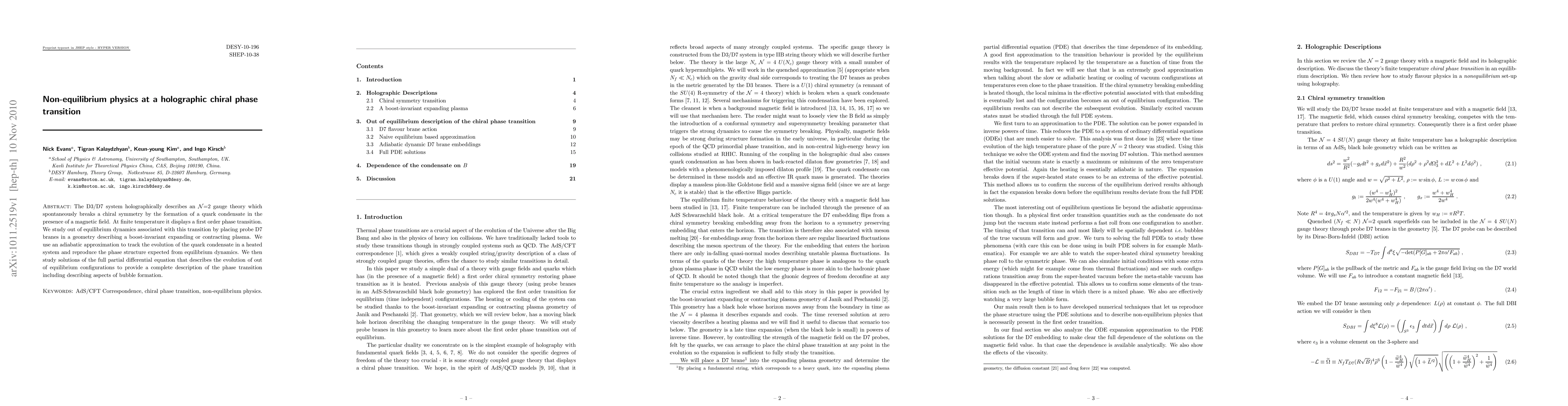 The D3/D7 system holographically describes an N=2 gauge theory which spontaneously breaks a chiral symmetry by the formation of a quark condensate in the presence of a magnetic field. At finite temperature it displays a first order phase transition. We study out of equilibrium dynamics associated with this transition by placing probe D7 branes in a geometry describing a boost-invariant expanding or contracting plasma. We use an adiabatic approximation to track the evolution of the quark condensate in a heated system and reproduce the phase structure expected from equilibrium dynamics. We then study solutions of the full partial differential equation that describes the evolution of out of equilibrium configurations to provide a complete description of the phase transition including describing aspects of bubble formation.