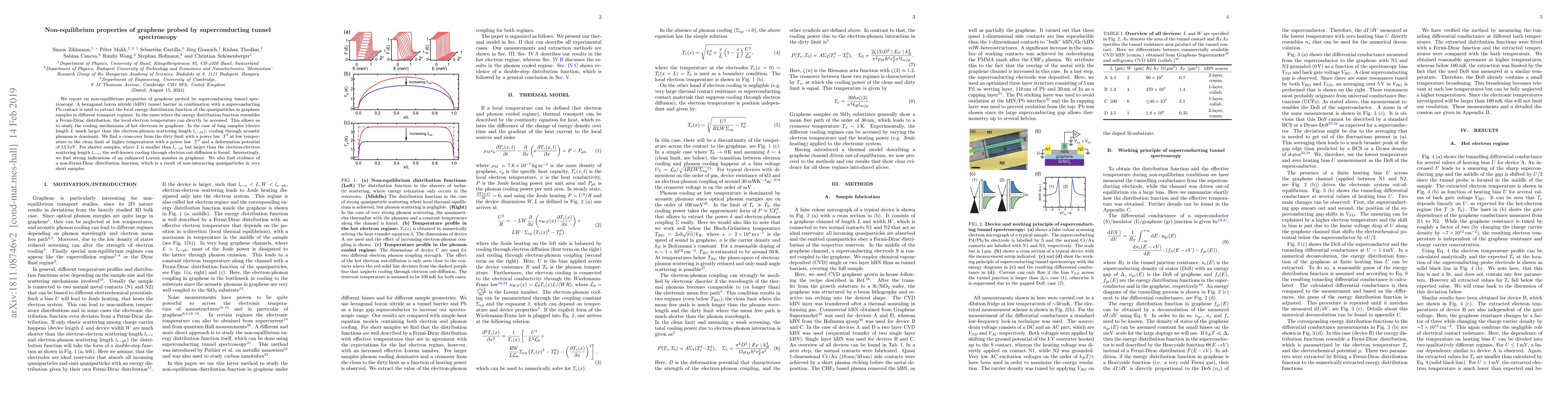 This study investigates the non-equilibrium properties of graphene using superconducting tunnel spectroscopy, revealing distinct cooling mechanisms in long and short samples. Long samples predominantly cool via acoustic phonons, transitioning from a $T^3$ to a $T^4$ power law with temperature, while short samples cool through electron out-diffusion. The research also uncovers an enhanced Lorenz number and a non-Fermi-Dirac distribution in very short samples.