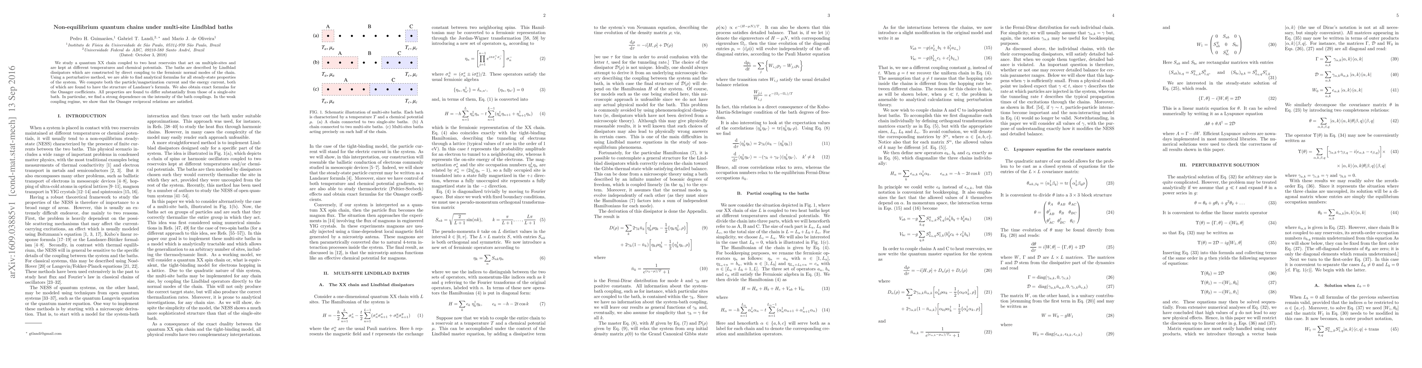 This paper investigates a quantum XX chain interacting with two multi-site Lindblad baths at different temperatures and chemical potentials, deriving analytical formulas for steady-state properties and finding significant differences from single-site baths, especially in the weak coupling regime where Onsager's reciprocal relations hold.