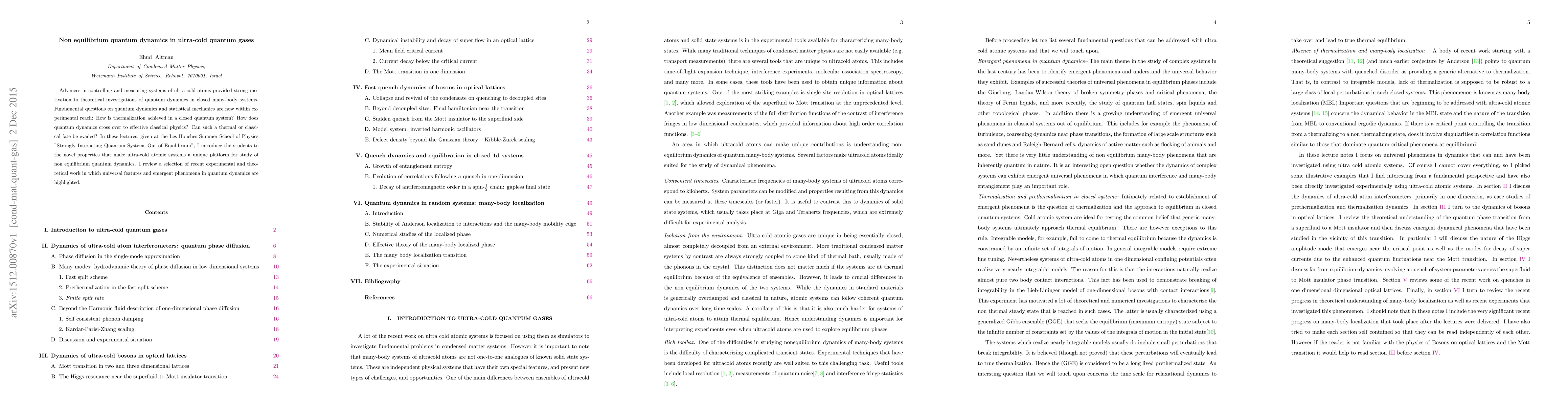 Advances in controlling and measuring systems of ultra-cold atoms provided strong motivation to theoretical investigations of quantum dynamics in closed many-body systems. Fundamental questions on quantum dynamics and statistical mechanics are now within experimental reach: How is thermalization achieved in a closed quantum system? How does quantum dynamics cross over to effective classical physics? Can such a thermal or classical fate be evaded? In these lectures, given at the Les Houches Summer School of Physics "Strongly Interacting Quantum Systems Out of Equilibrium", I introduce the students to the novel properties that make ultra-cold atomic systems a unique platform for study of non equilibrium quantum dynamics. I review a selection of recent experimental and theoretical work in which universal features and emergent phenomena in quantum dynamics are highlighted.