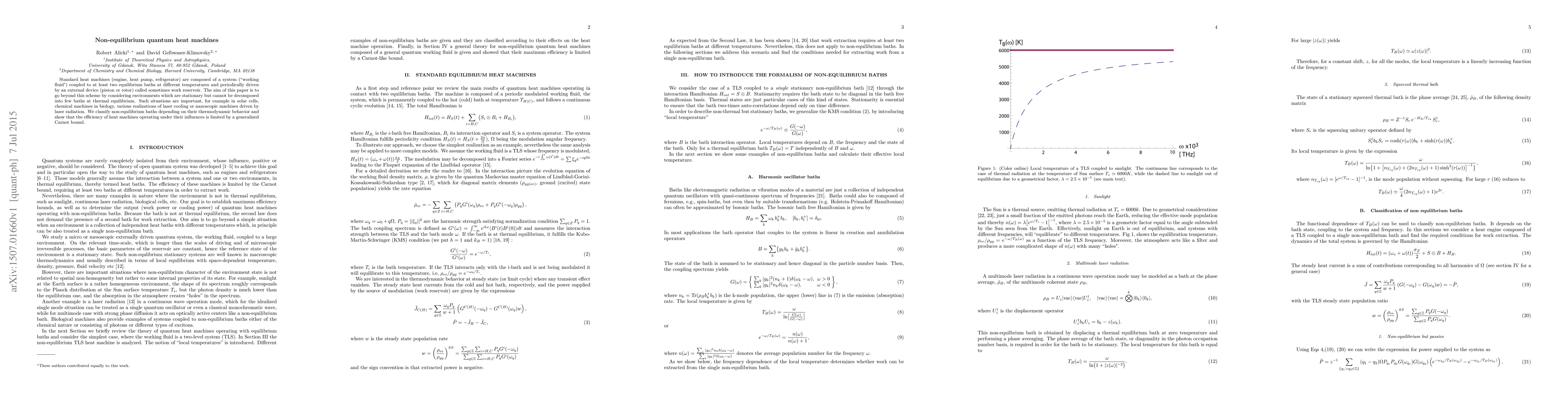 Standard heat machines (engine, heat pump, refrigerator) are composed of a system ("working fluid") coupled to at least two equilibrium baths at different temperatures and periodically driven by an external device (piston or rotor) called sometimes work reservoir. The aim of this paper is to go beyond this scheme by considering environments which are stationary but cannot be decomposed into few baths at thermal equilibrium. Such situations are important, for example in solar cells, chemical machines in biology, various realizations of laser cooling or nanoscopic machines driven by laser radiation. We classify non-equilibrium baths depending on their thermodynamic behavior and show that the efficiency of heat machines operating under their influences is limited by a generalized Carnot bound.