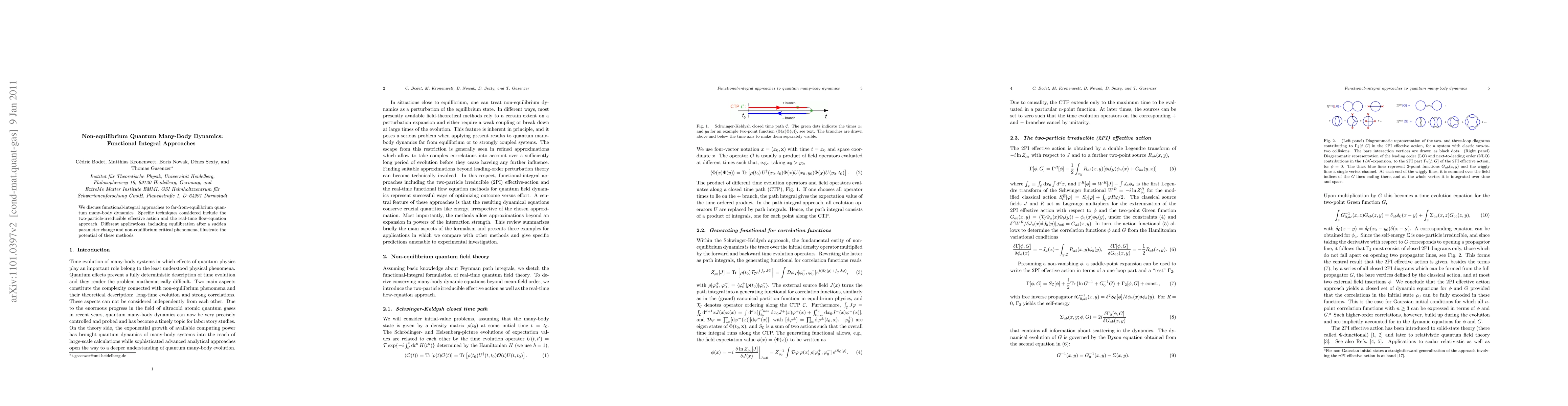 This paper explores functional-integral approaches to study far-from-equilibrium quantum many-body dynamics, focusing on the two-particle-irreducible effective action and real-time flow-equation methods. It demonstrates their applications in equilibration and non-equilibrium critical phenomena.