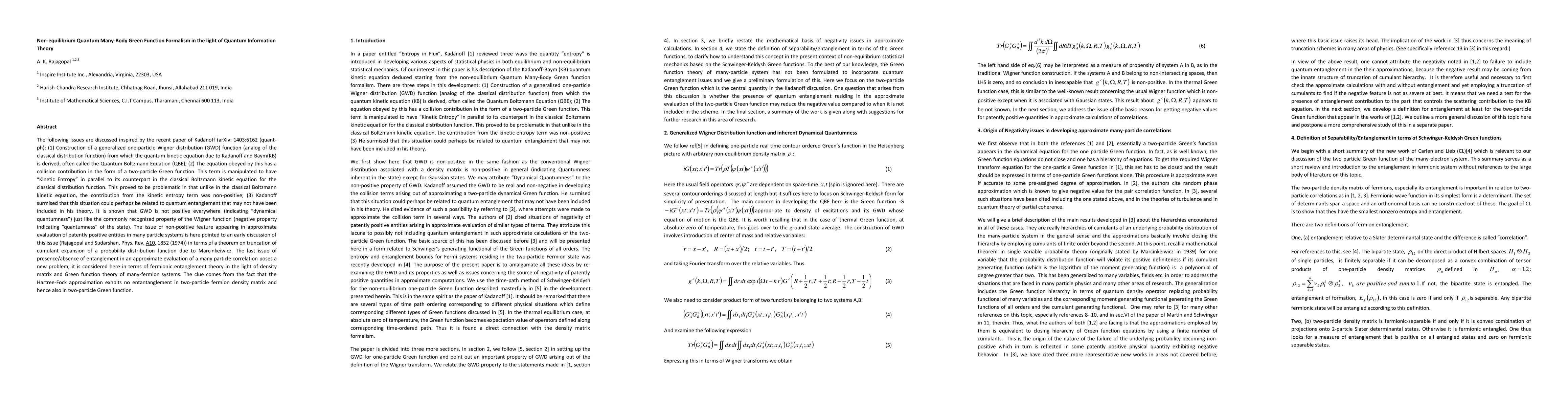 The following issues are discussed inspired by the recent paper of Kadanoff (arXiv: 1403:6162): (a) Construction of a generalized one-particle Wigner distribution (GWD) function (analog of the classical distribution function) from which the quantum kinetic equation due to Kadanoff and Baym (KB) is derived, often called the Quantum Boltzmann Equation (QBE); (b) The equation obeyed by this has a collision contribution in the form of a two-particle Green function. This term is manipulated to have Kinetic Entropy in parallel to its counterpart in the classical Boltzmann kinetic equation for the classical distribution function. This proved to be problematic in that unlike in the classical Boltzmann kinetic equation, the contribution from the kinetic entropy term was non-positive; (3) Kadanoff surmised that this situation could perhaps be related to quantum entanglement that may not have been included in his theory. It is shown that GWD is not positive everywhere (indicating dynamical quantumness) just like the commonly recognized property of the Wigner function (negative property indicating quantumness of the state). The issue of non-positive feature appearing in approximate evaluation of patently positive entities in many particle systems is here pointed to an early discussion of this issue (Phys. Rev. A10, 1852 (1974)) in terms of a theorem on truncation of cumulant expansion of a probability distribution function due to Marcinkeiwicz. The last issue of presence or absence of entanglement in an approximate evaluation of a many particle correlation poses a new problem; it is considered here in terms of fermionic entanglement theory in the light of density matrix and Green function theory of many-fermion systems. The clue comes from the fact that the Hartree-Fock approximation exhbits no entantanglement in two-particle fermion density matrix and hence also in two-particle Green function.
