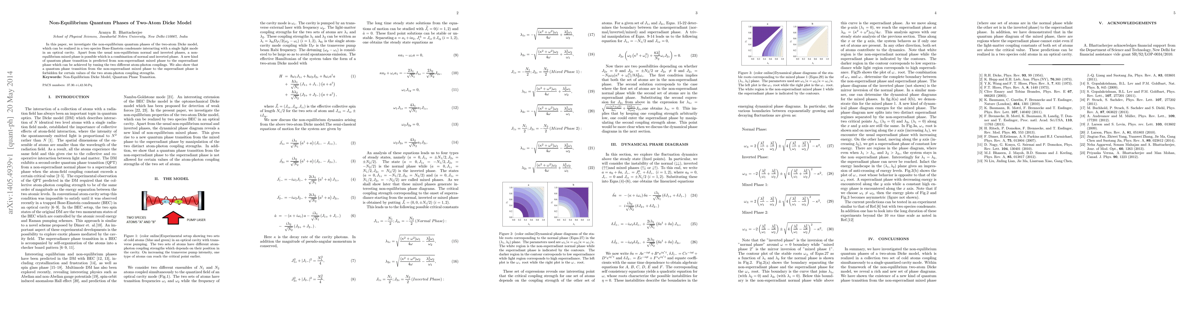 This paper explores the non-equilibrium quantum phases of the two-atom Dicke model in a Bose-Einstein condensate, identifying a new mixed phase alongside normal and inverted phases. It predicts a unique quantum phase transition from non-superradiant mixed to superradiant phase via tuning atom-photon couplings, while also noting conditions under which such a transition is impossible.