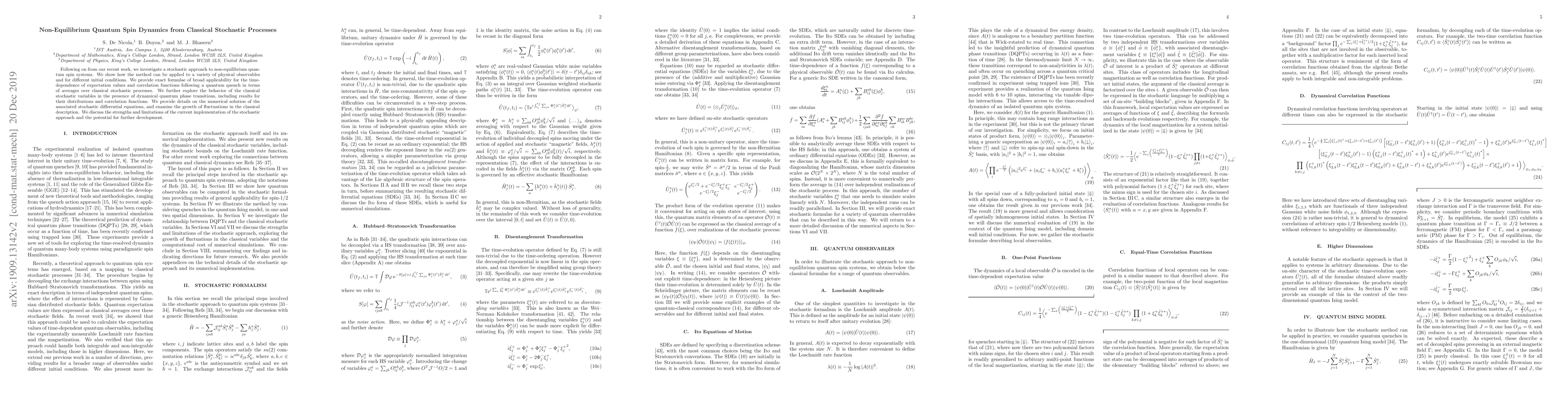 This paper explores a stochastic method for non-equilibrium quantum spin dynamics, providing exact formulae for time-dependent expectation values and correlation functions post-quantum quench. It examines the behavior of classical stochastic variables during dynamical quantum phase transitions and discusses the numerical solutions for associated stochastic differential equations.